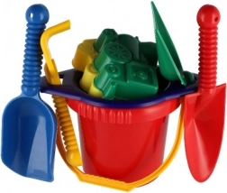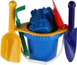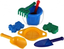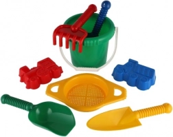 Contiene tutti gli strumenti necessari per costruire e giocare in modo creativo sulla sabbia - secchio, setaccio, palette, rastrello e due formine.