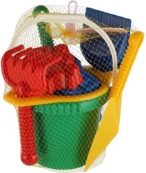 Questo set di plastica per la sabbia include diversi strumenti e forme per costruzioni e creazioni fantastiche. Grazie alla sua confezione pratica in una rete di dimensioni 20x28x12 cm, il set può essere trasportato facilmente.