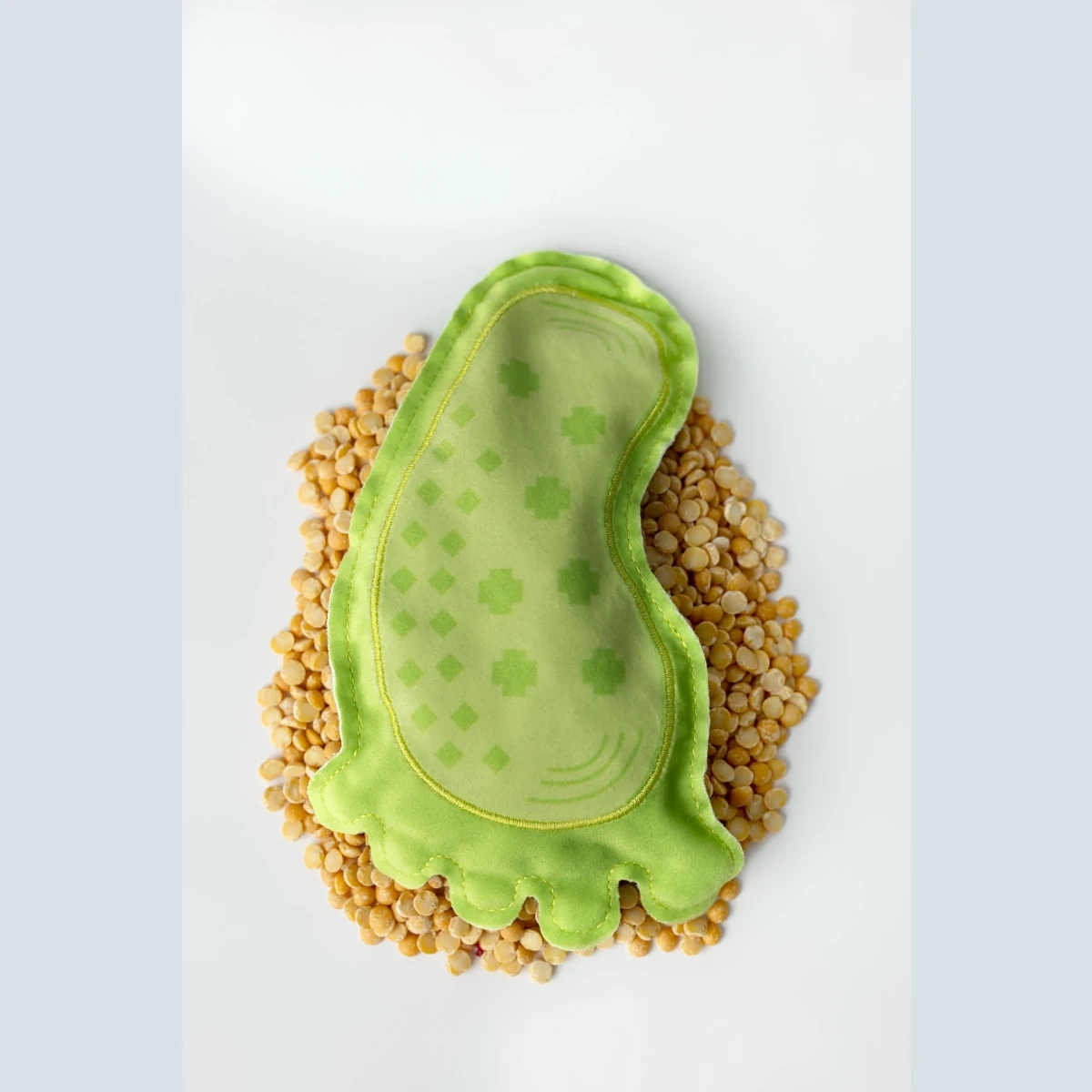 Ogni cuscinetto offre una texture diversa: bucce di grano saraceno, semi di lino, noccioli di ciliegia, riso, soia, grano saraceno, miglio e piselli. I bambini riconoscono le diverse superfici e rinforzano la percezione tattile.