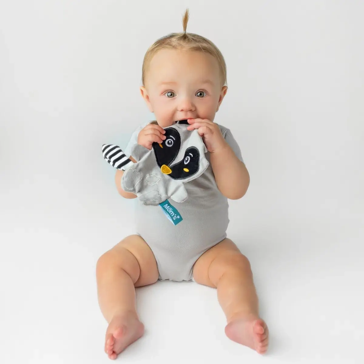 Il procione frusciante Pedro di Mom's Care è un giocattolo sensoriale morbidissimo per neonati fin dalla nascita, che sviluppa vista, udito e tatto. Gli elementi a contrasto in bianco e nero favoriscono la percezione, la pellicola frusciante offre un suono calmante e le diverse texture invogliano ad afferrare e allenare la motricità fine.