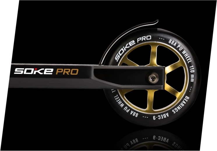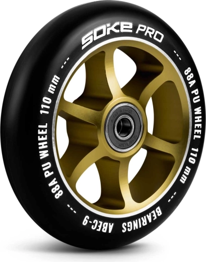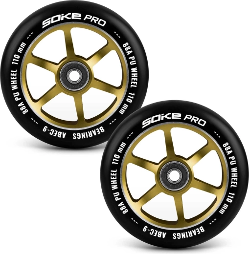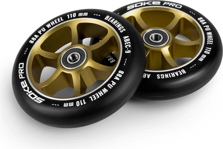 Il set di due ruote SOKE da 110 mm garantisce prestazioni affidabili per l’uso quotidiano e i trick. Il poliuretano 88A rappresenta un ottimo compromesso tra aderenza e velocità, mentre i cuscinetti ABEC‑9 assicurano una scorrevolezza eccezionale. Il core in alluminio in color oro aumenta rigidità e resistenza negli atterraggi e nelle manovre impegnative.