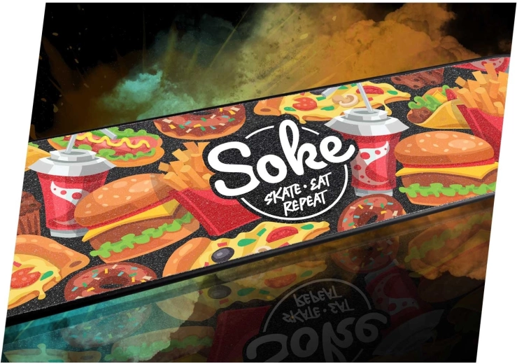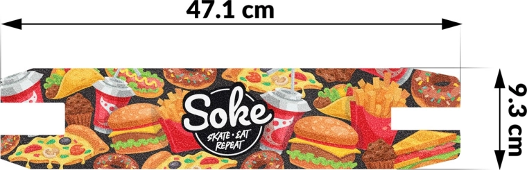 Migliora il controllo del tuo monopattino con il grip tape SOKE Go! – Fast Food. La grana più ruvida offre un contatto saldo e stabile tra scarpa e pedana, così puoi concentrarti al massimo sull'apprendimento di nuovi trick e su combinazioni avanzate. La grafica stilosa dona alla tua pedana un look originale e ti distingue al park e in strada.