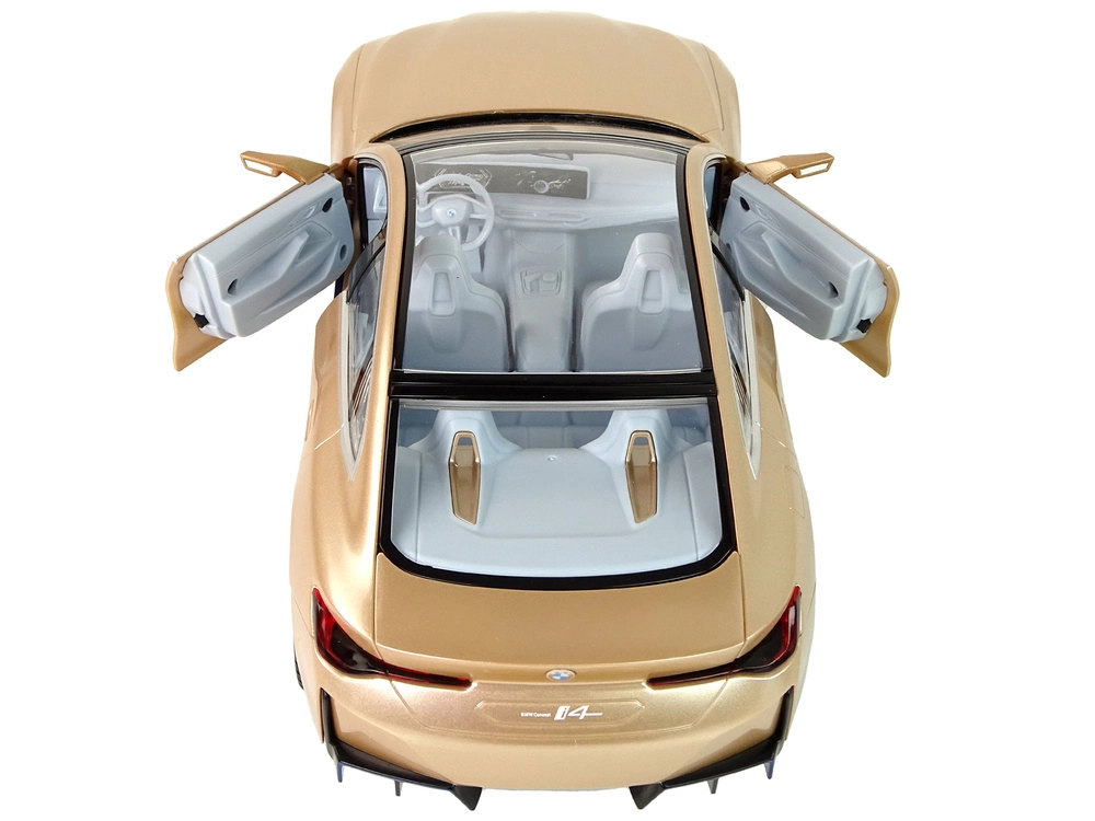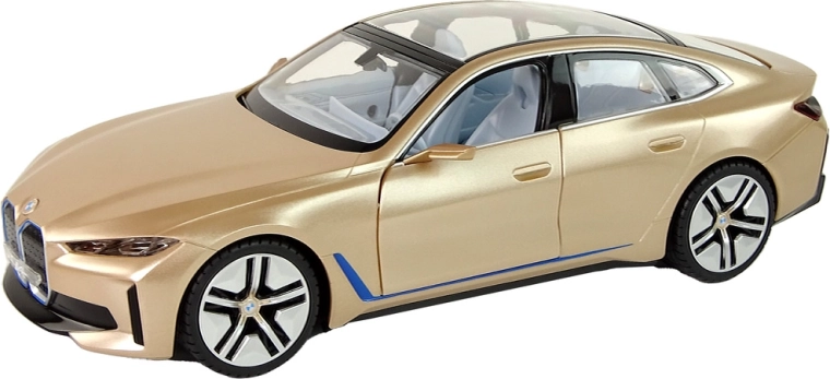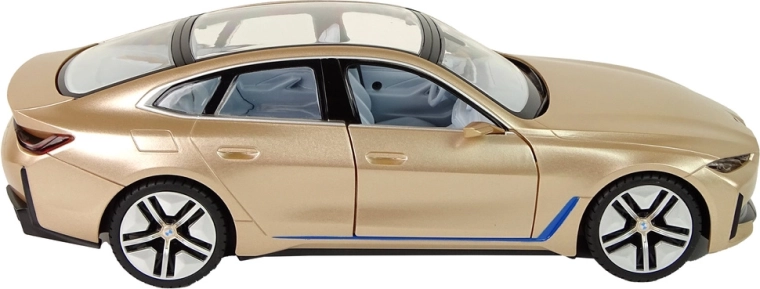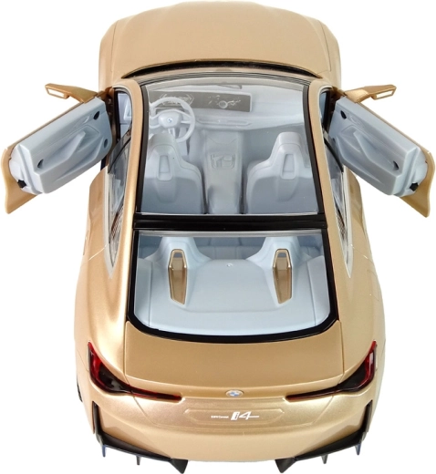 Carrozzeria dettagliata della BMW i4 con tetto panoramico, linee precise e vernice oro lucida in scala 1:14: fa un’ottima figura in pista e in vetrina.