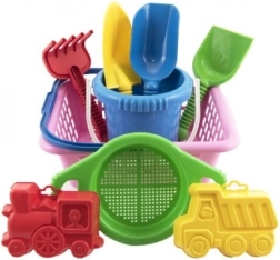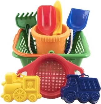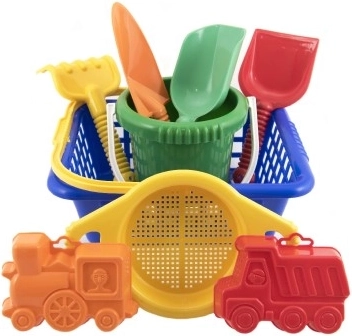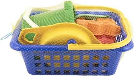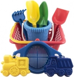 Allegro set da sabbia per bambini con pratico cestino, include tutto il necessario per il divertimento in spiaggia e nella sabbiera: secchiello, paletta, badile, rastrellino, setaccio e 2 formine. La plastica resistente e leggera è adatta ai bambini da 12 mesi e favorisce la motricità fine e la fantasia.