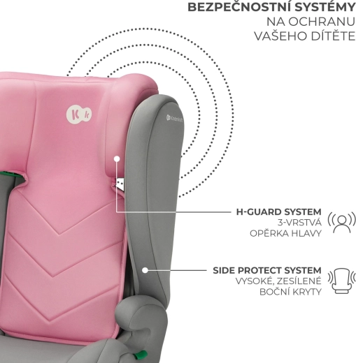 La protezione è garantita dalla combinazione dei sistemi H-GUARD (poggiatesta a 3 strati) e SPS (rinforzi laterali), che aiutano ad assorbire l’energia d’impatto e a proteggere testa, collo, spalle e colonna del bambino. Il poggiatesta si regola con una mano in 10 livelli, così il seggiolino cresce insieme al bambino. Per i bambini più alti è possibile rimuovere lo schienale e ottenere un rialzo per 140–150 cm conforme alla R129.