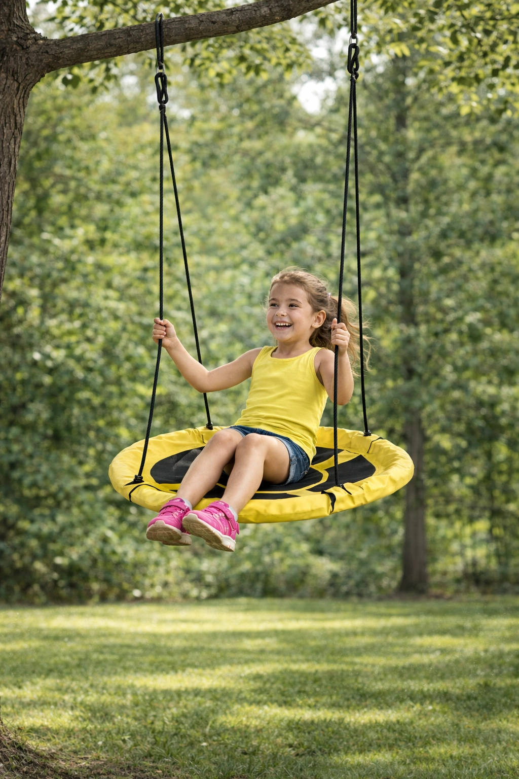 Il grande diametro offre spazio sufficiente per un dondolio comodo, relax e divertimento condiviso da più bambini.
