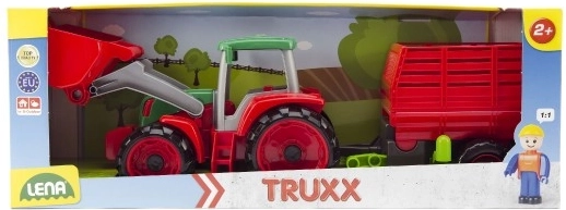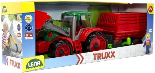 Presentiamo il trattore Lena Truxx con rimorchio, il giocattolo ideale per i piccoli agricoltori. Questo trattore in plastica si distingue per il suo design robusto in colori rosso e verde, dotato di una pala funzionale e un rimorchio rimovibile. Nella cabina del trattore è posizionata una piccola figurina di conducente che aggiunge realismo al gioco.