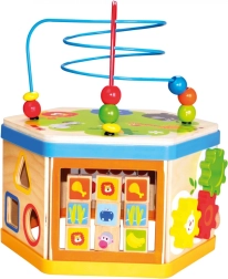 Il giocattolo motorico multisfaccettato attira i bambini curiosi con colori vivaci e numerose attività arricchite da un aspetto didattico. Si possono guidare le perline nel labirinto, contare le palline, spostare le icone degli animaletti, farle ruotare e abbinare loro il cibo, girare gli ingranaggi, inserire i blocchi e imparare a riconoscere l’ora. Il giocattolo è robusto, realizzato in compensato spesso. Caratteristiche principali: cubo con coperchio e 3 elementi per l’inserimento, sviluppa l’orientamento nello spazio e nel tempo, abbina forme e colori, allena la motricità fine, realizzazione robusta in legno