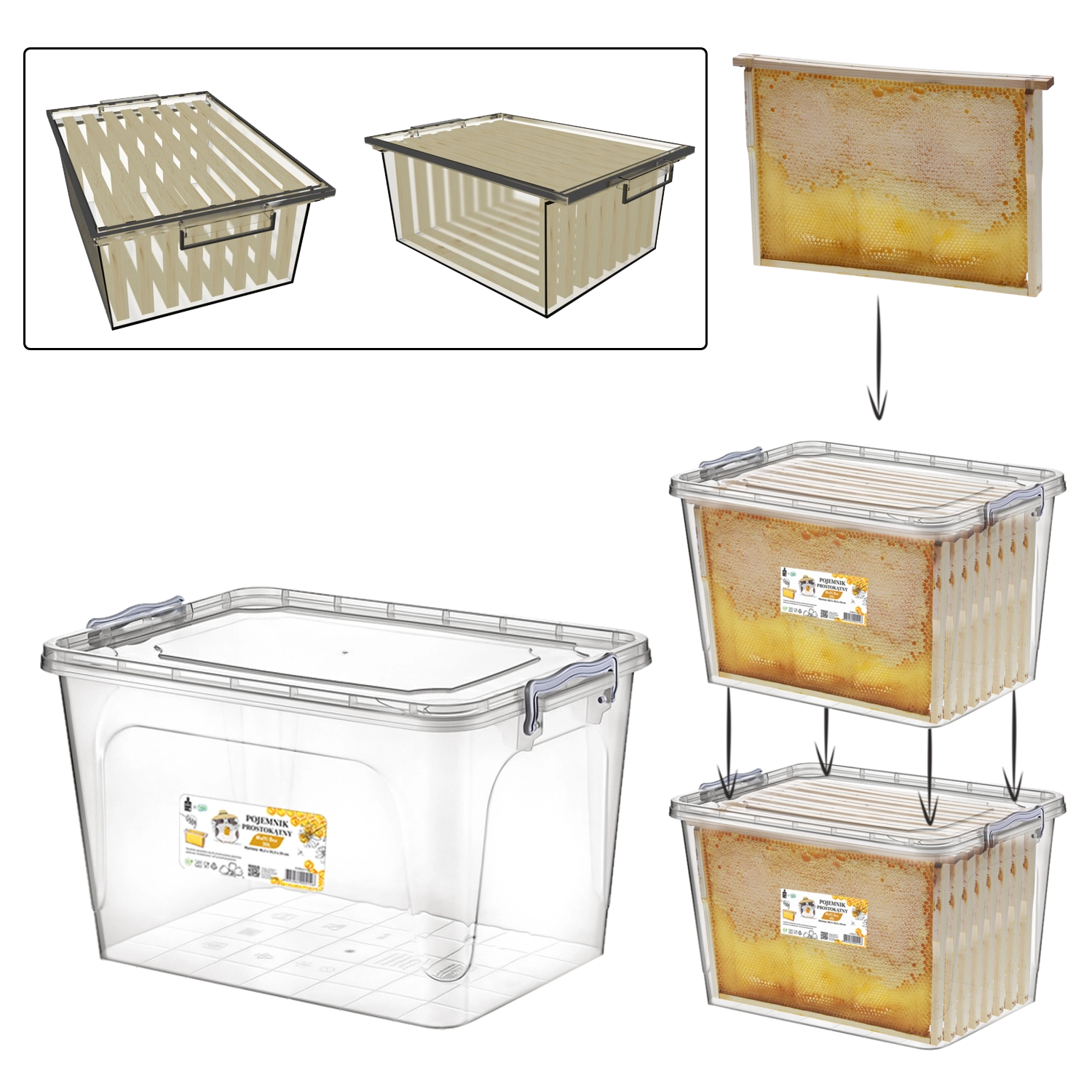 Pratica e resistente scatola di stoccaggio da 30 l per conservare in sicurezza i telai da apicoltura. Grazie agli appositi rilievi i telai non toccano le pareti, il coperchio ermetico protegge dai parassiti e la struttura trasparente facilita il controllo del contenuto. La scatola è impilabile, dispone di maniglie laterali per un facile trasporto e può contenere fino a 8 telai (Wielkopolska) oppure 16 telai 1/2.