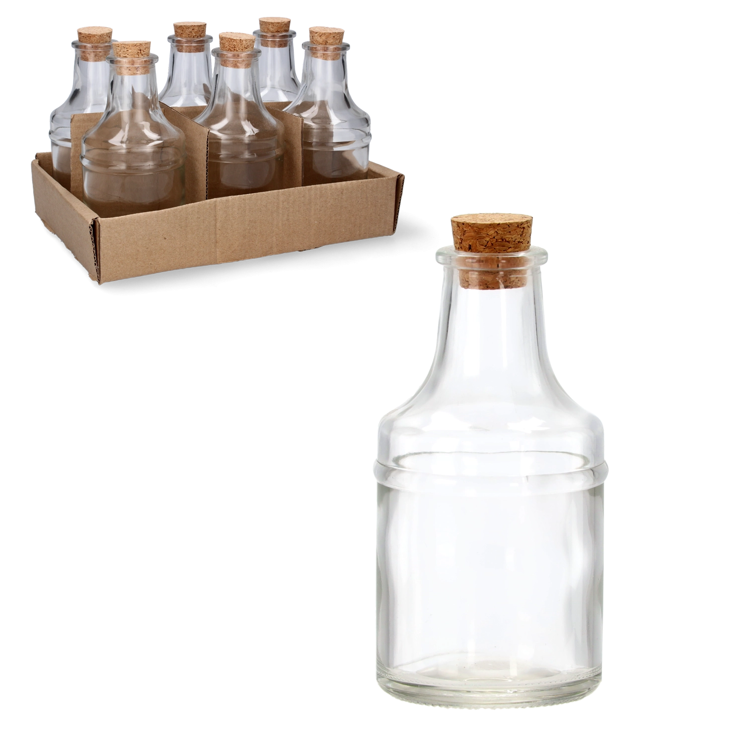 Pratica bottiglia in vetro da 200 ml con tappo in sughero naturale. Il vetro spesso e resistente protegge il contenuto e il sughero dal design elegante dona alla bottiglia un carattere unico. Ideale per succhi, aceto, olio d'oliva e liquori fatti in casa.