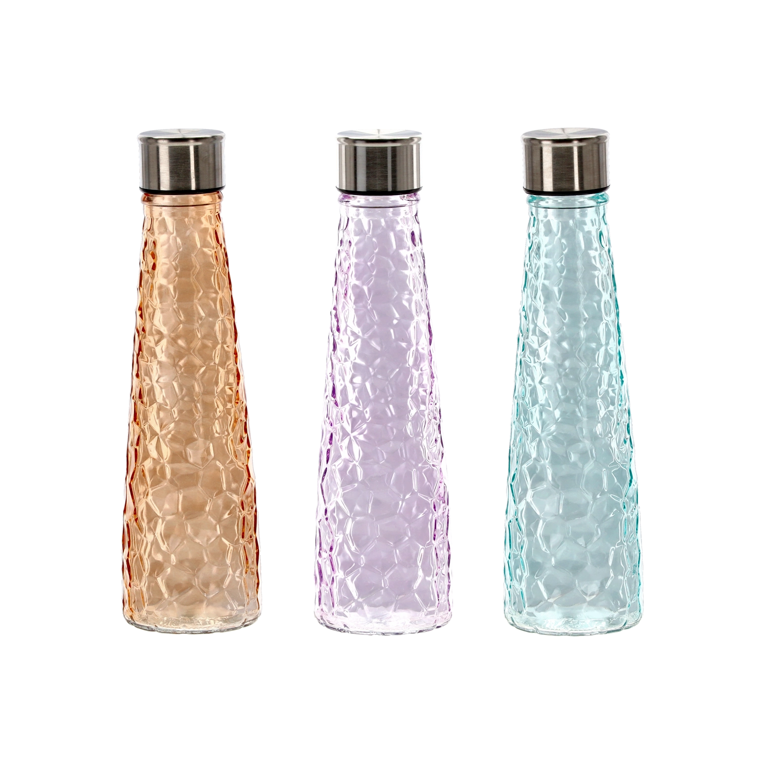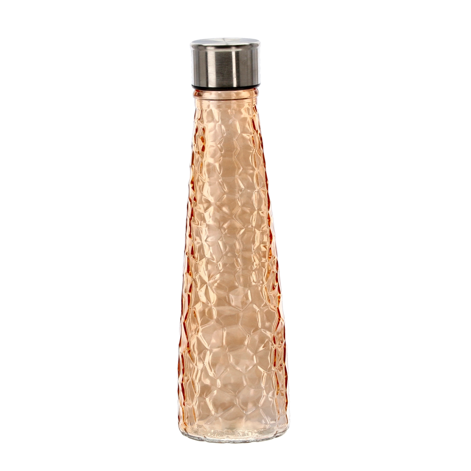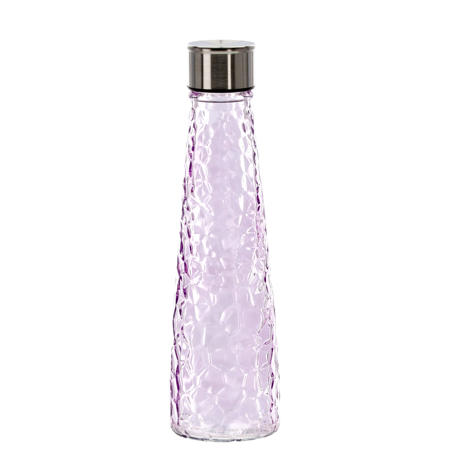 Questa bottiglia in vetro da 0,5 litri unisce design elegante e praticità. Il corpo in vetro resistente con un delicato motivo martellato/facetato è comodo da impugnare e aiuta a prevenire lo scivolamento. Il tappo a vite in acciaio inox garantisce una chiusura sicura, così puoi trasportare la bottiglia in borsa o nello zaino senza preoccupazioni.