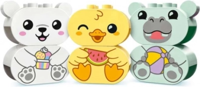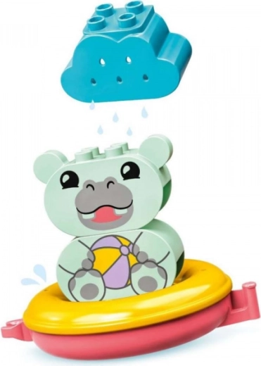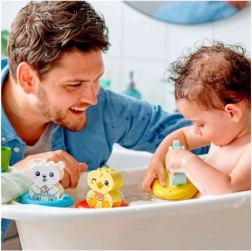 L’ippopotamino, la paperella e l’orsetto polare siedono su anelli colorati che scivolano sull’acqua e si possono collegare per creare un trenino, per un divertimento ancora maggiore nella vasca.