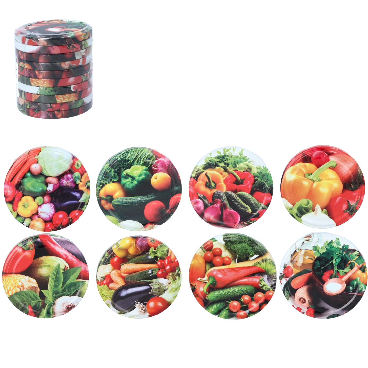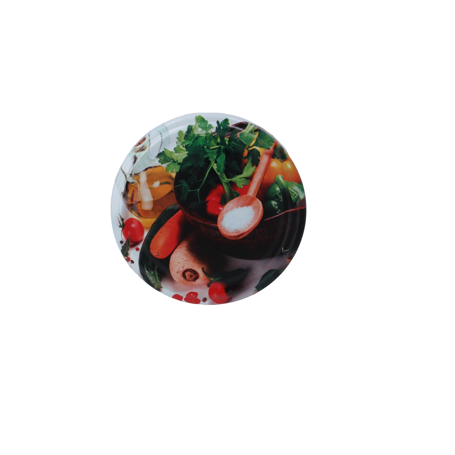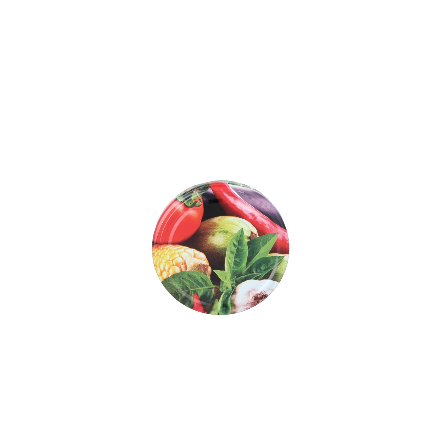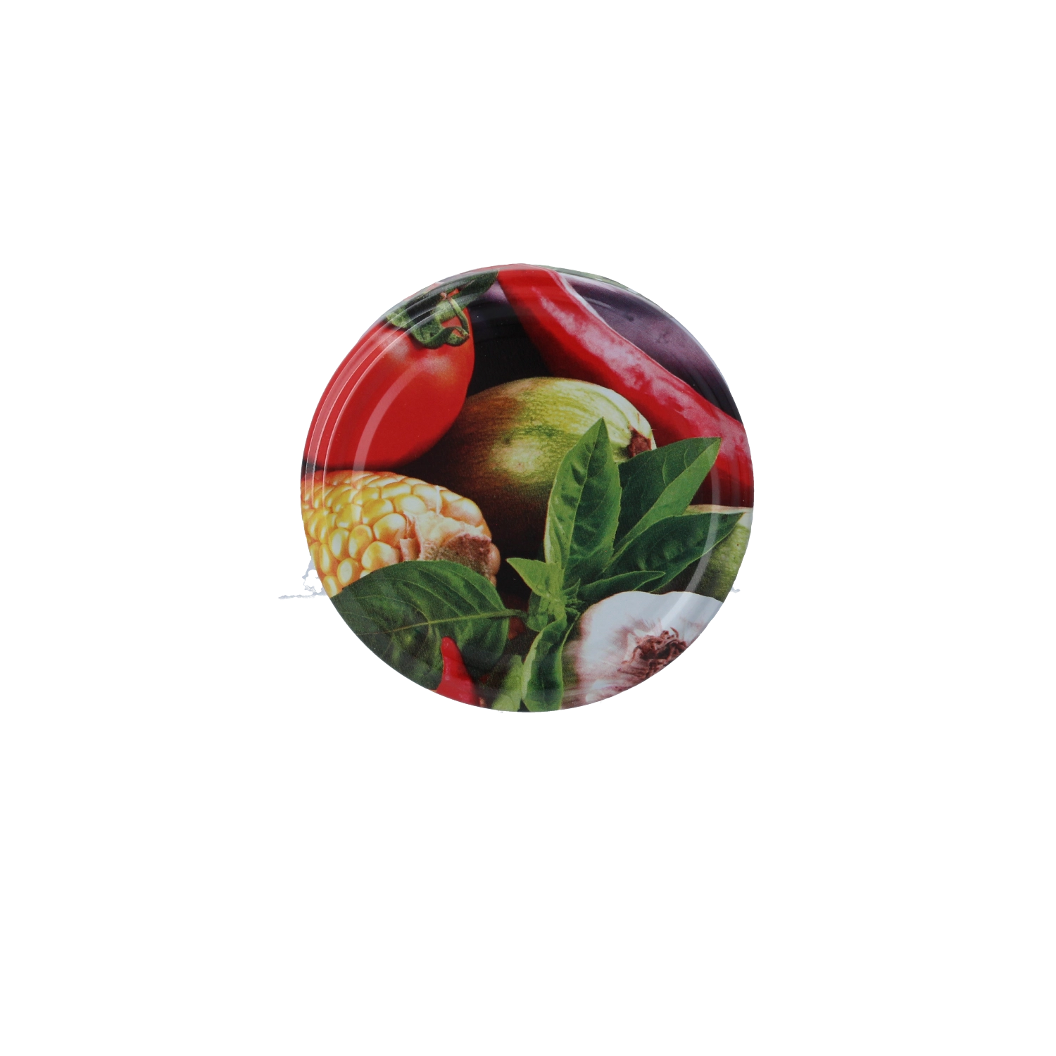 Realizzati in metallo di alta qualità idoneo al contatto con gli alimenti, proteggono da essiccazione, umidità e ossidazione. La superficie lucida con motivo di verdure a colori dona alle conserve un aspetto pulito ed estetico in ogni cucina. I coperchi sono progettati per un uso ripetuto e una facile manutenzione.