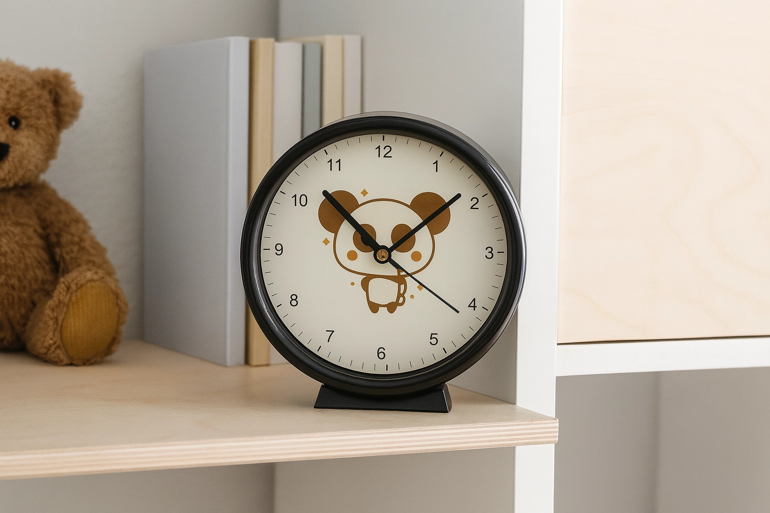 Un design giocoso con orsetto, gattino o panda illumina la cameretta e motiva ad imparare l’ora.
