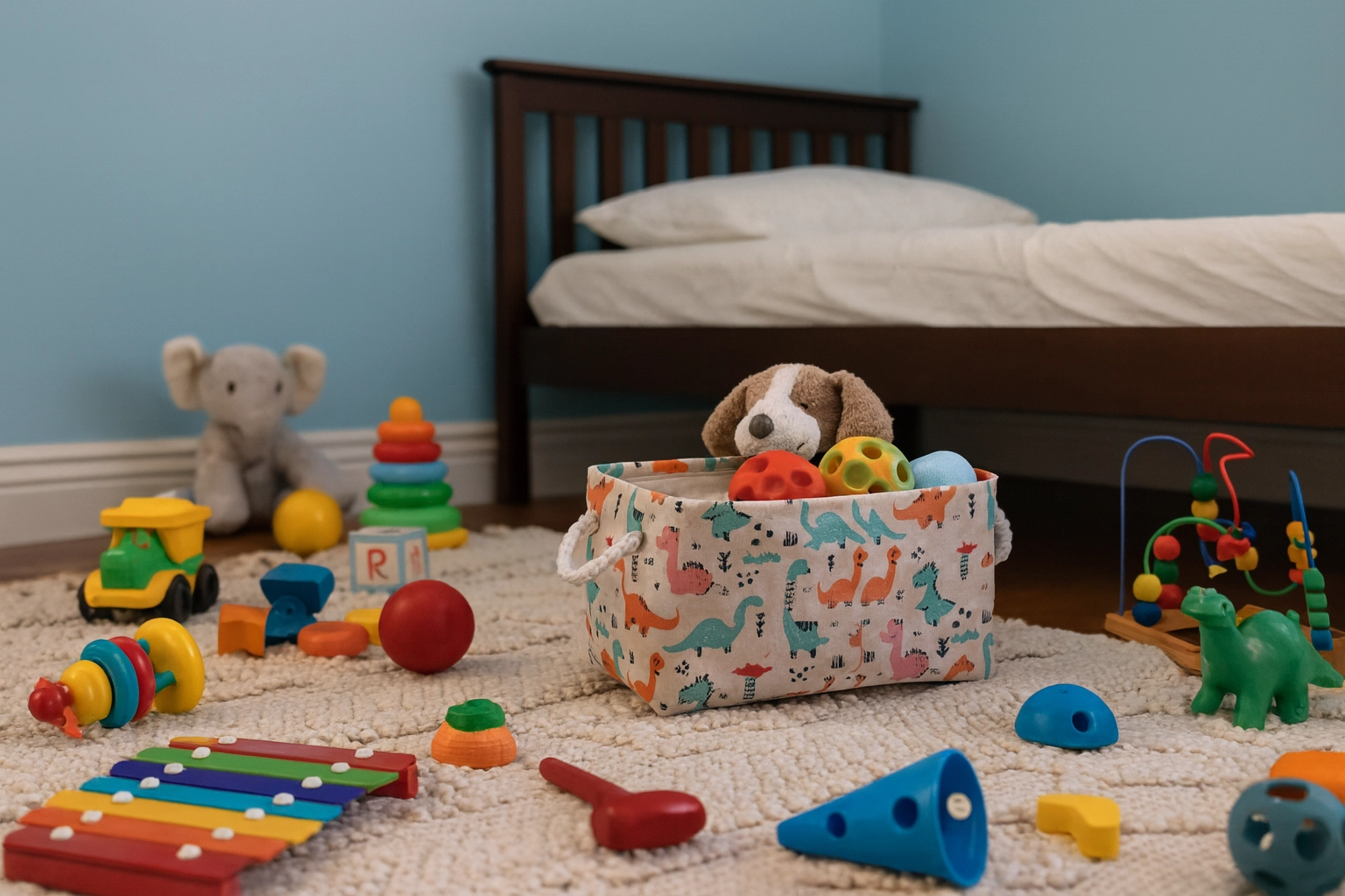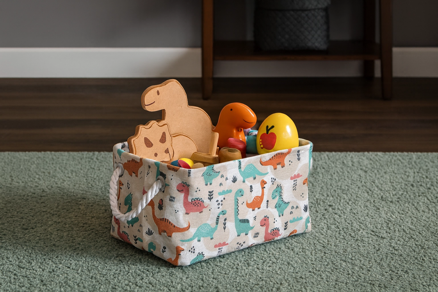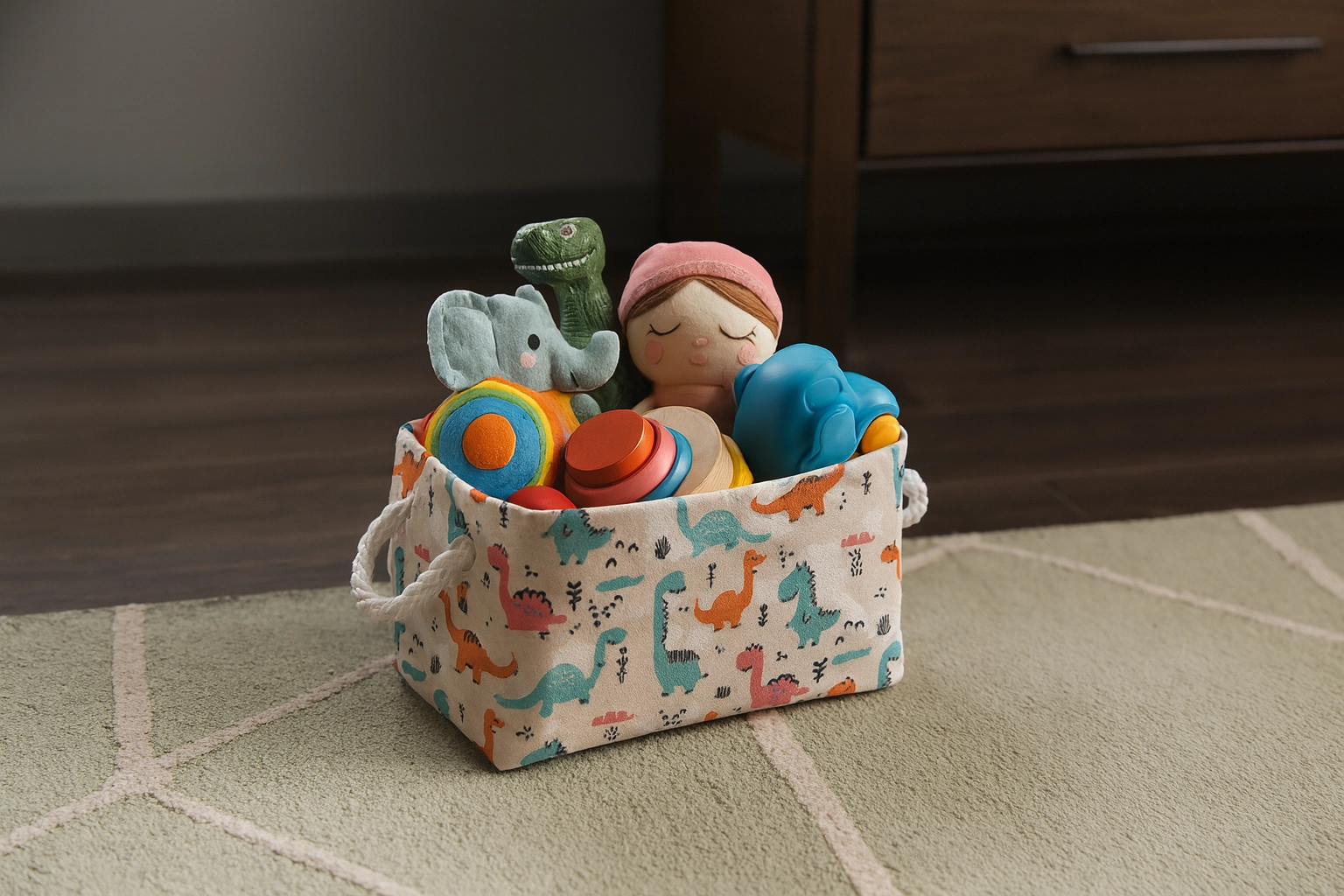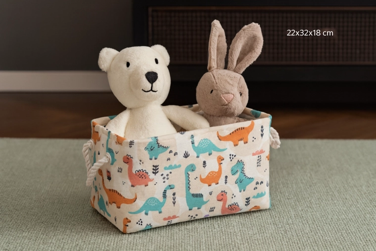 Il cesto tessile con dinosauri colorati è la scelta ideale per riporre in modo ordinato giocattoli, libricini e piccoli oggetti. I lati morbidi proteggono mobili e pavimenti e l’apertura superiore consente ai bambini un accesso facile. La struttura leggera ma solida in poliestere resistente sopporta l’uso quotidiano e i frequenti spostamenti tra le stanze.