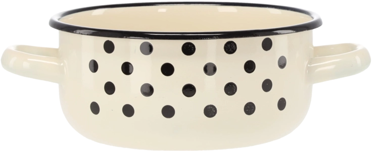 Questa casseruola smaltata, bianca con un delicato motivo a pois, si integra perfettamente in ogni cucina. I due manici robusti consentono un facile trasporto anche a pieno carico. Capacità 1,5 l e diametro 16 cm la rendono una scelta universale per salse, zuppe e per riscaldare velocemente.