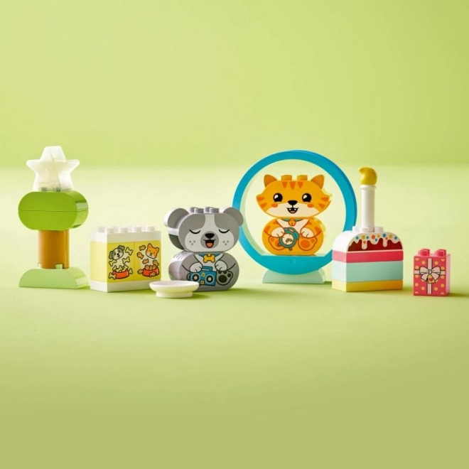 Il set LEGO DUPLO Il mio primo cagnolino e gattino con suoni (10977) permette ai bambini da 1,5 anni di esplorare il mondo attraverso il gioco. I simpatici modelli animali di un cagnolino e di un gattino si possono montare facilmente con pochi mattoncini. Posizionando gli animali nel cerchio rotante, si attivano i suoni che aiutano i più piccoli ad imparare le azioni quotidiane come nutrirsi, giocare o dormire.