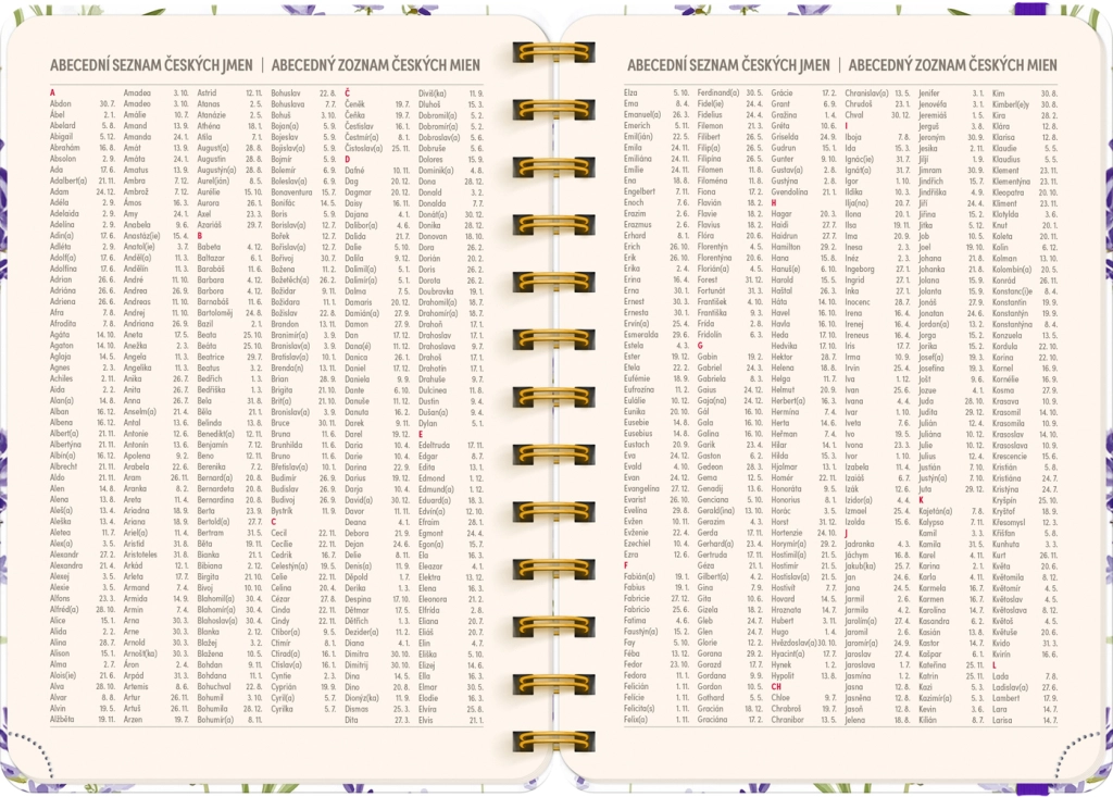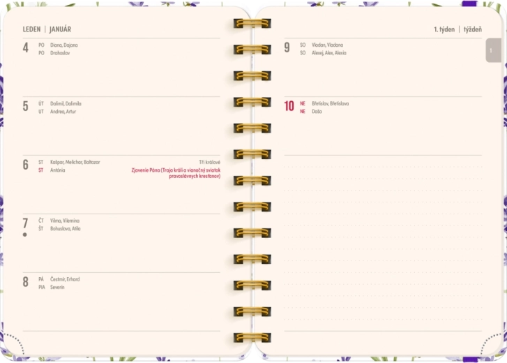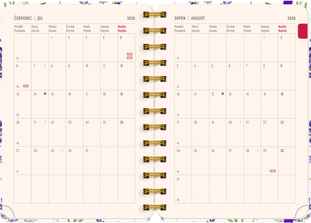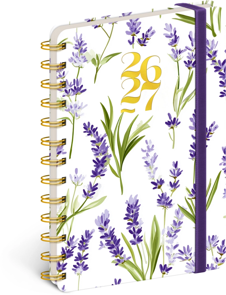L’elegante agenda Petito di 18 mesi con motivo lavanda unisce chiarezza e stile per la pianificazione da luglio 2026 a dicembre 2027. Offre un calendario settimanale in righe con nomi e festività ceche e slovacche, panoramiche mensili per gli anni 2026 e 2027 e ampio spazio per appunti ogni settimana.