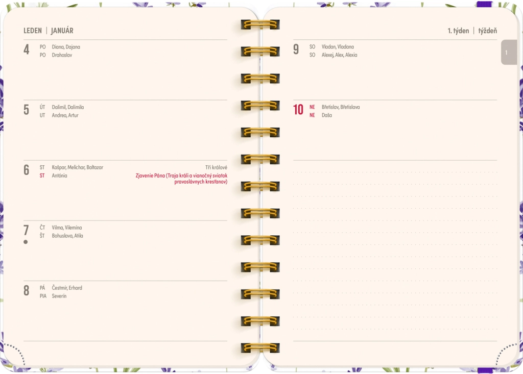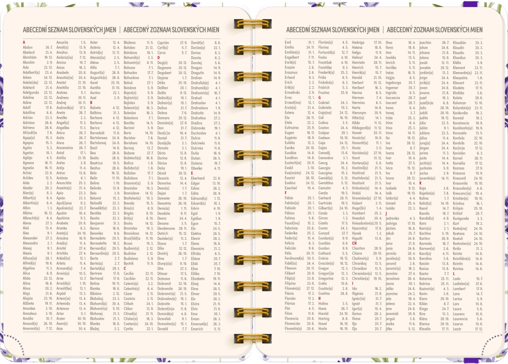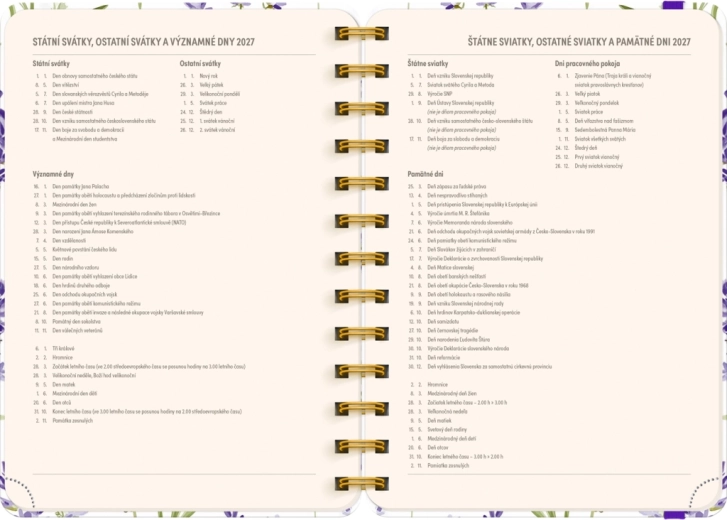 - Calendario settimanale in righe con nomi e festività ceche e slovacche