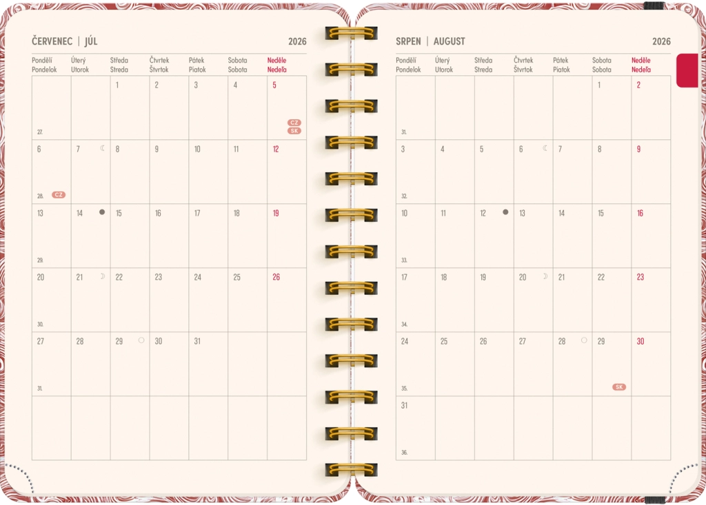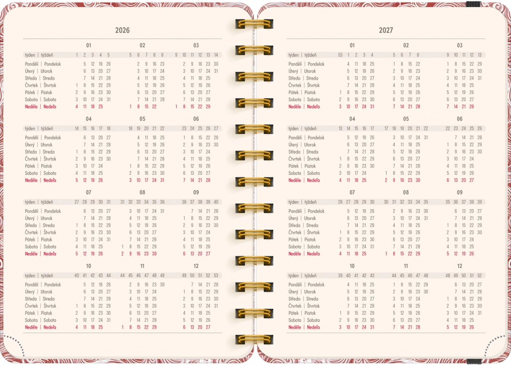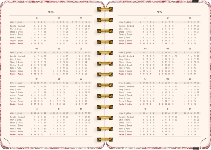 L’agenda contiene tutto ciò di cui hai bisogno per organizzare il tempo in modo efficiente: panoramiche annuali 2026 e 2027, elenco dei nomi cechi e slovacchi e ampio spazio per appunti in ogni settimana. Il motivo Nuvole aggiunge leggerezza e chiarezza ai tuoi piani.