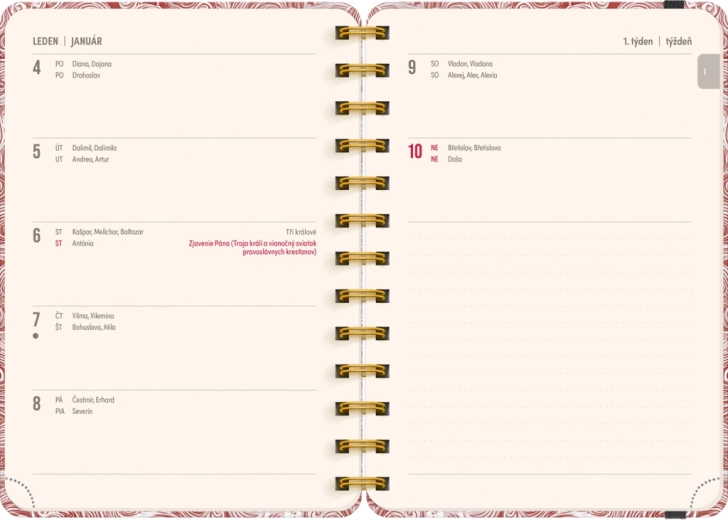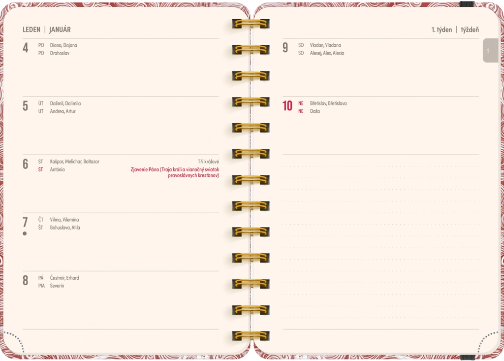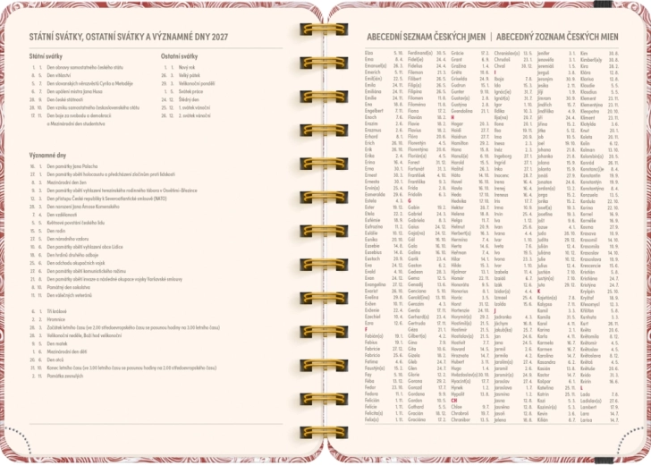 - Calendario settimanale a righe: ceco‑slovacco, con nomi e festività