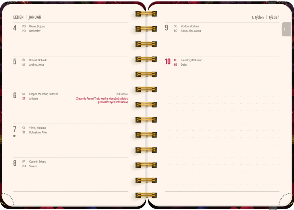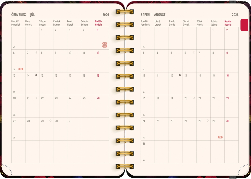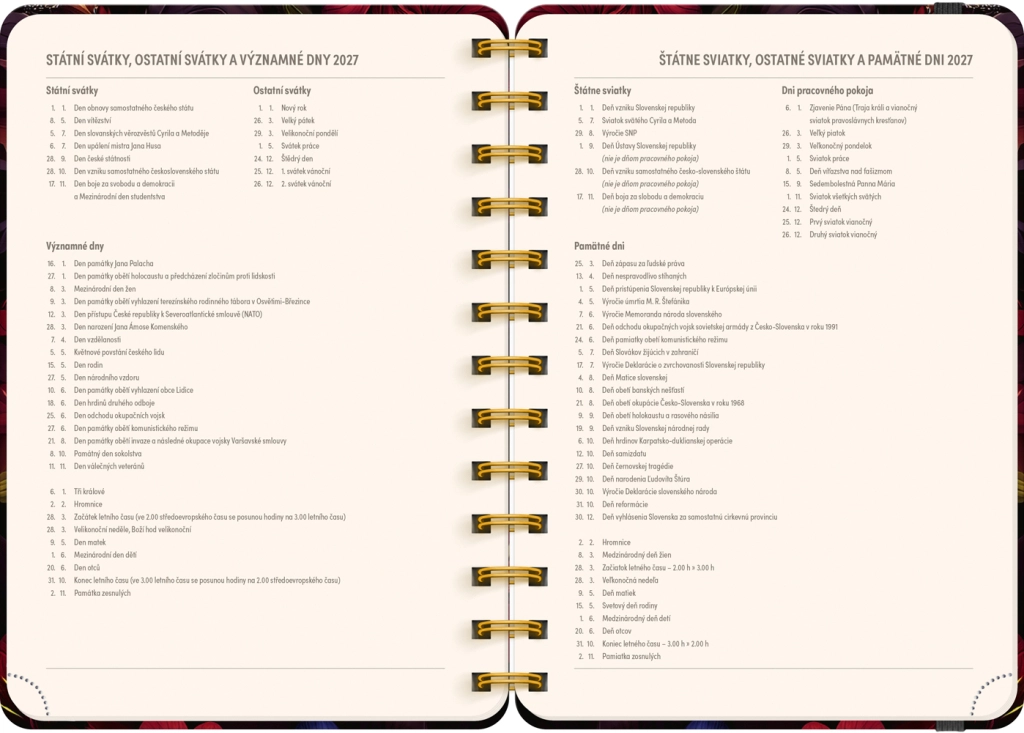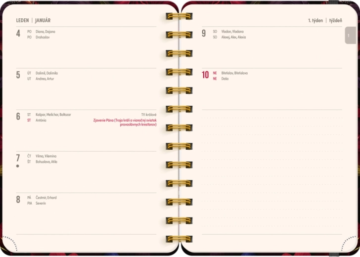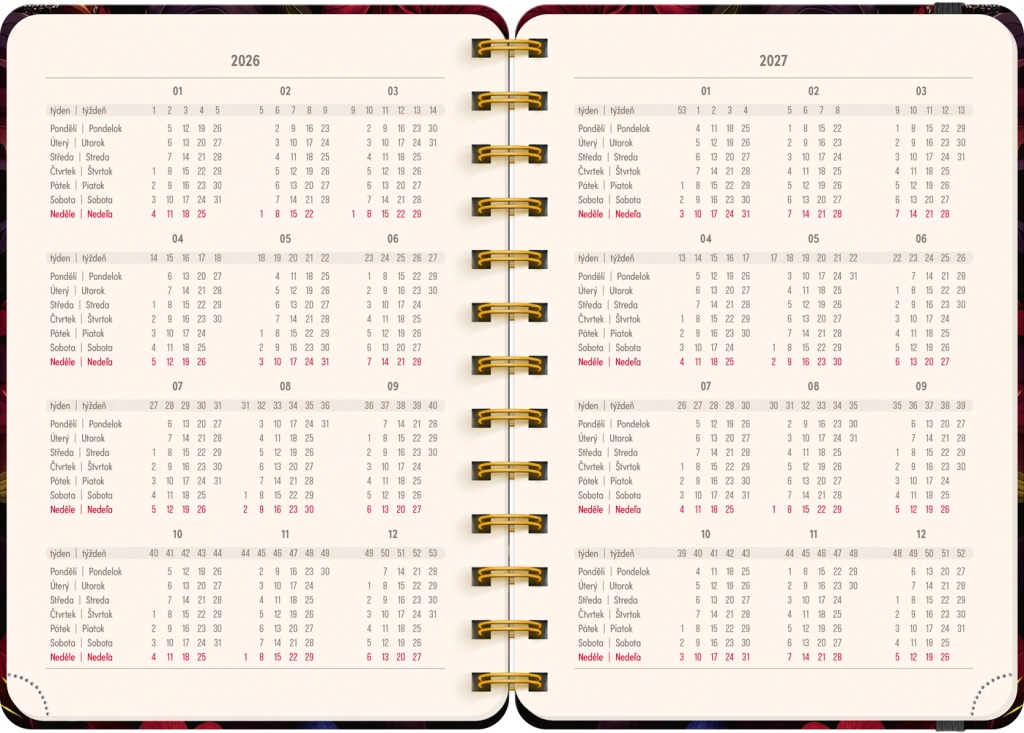 Elegante agenda di 18 mesi con motivo a fiori rossi per il periodo 07/2026–12/2027, con pratico calendario settimanale ceco‑slovacco con nomi e festività, panoramiche degli anni 2026 e 2027 e ampio spazio per appunti in ogni settimana. Formato compatto 13 × 18 cm e rilegatura a spirale per scrivere comodamente a casa e in viaggio.