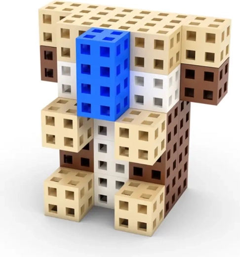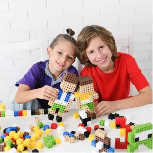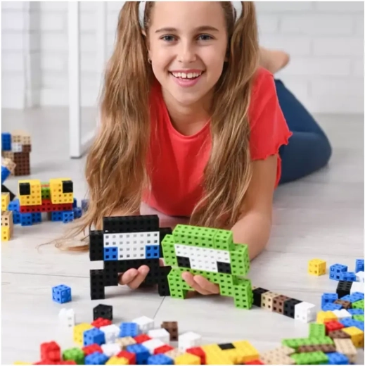 I blocchi a griglia con pin e fori si uniscono da più lati, così i bambini creano facilmente forme tridimensionali, personaggi e veicoli, sviluppando il pensiero spaziale.