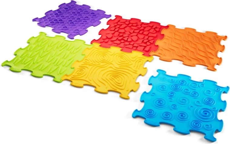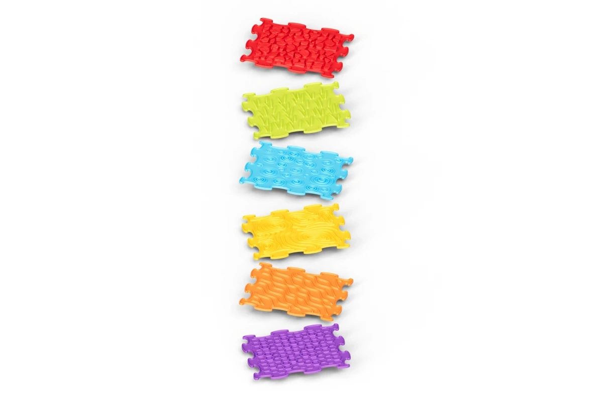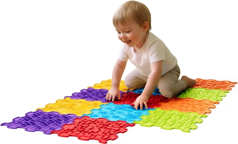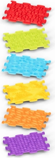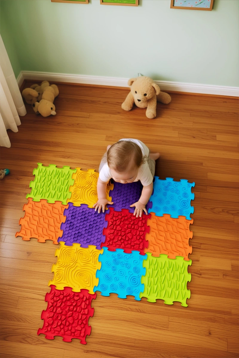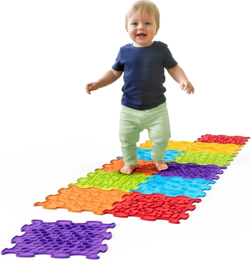 Crea per i bambini un vivace mondo sensoriale. I 12 elementi componibili come un puzzle formano percorsi variabili su cui i più piccoli possono gattonare e muovere i primi passi. Ogni piastrella presenta una texture antiscivolo diversa che massaggia delicatamente i piedi, stimola i recettori e favorisce la corretta percezione delle superfici.