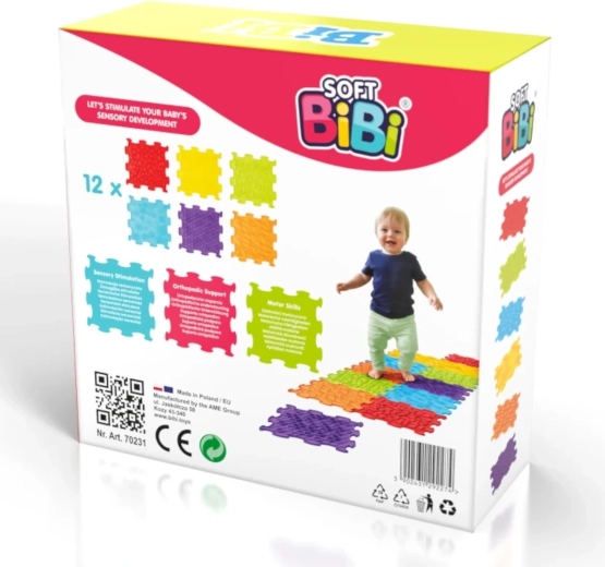 Il colorato set di 12 piastrelle sensoriali SOFT BIBI collegabili tra loro favorisce lo sviluppo del tatto, della motricità e dell’equilibrio dei bambini a partire da 6 mesi. Le diverse texture (rilievi, onde, motivi geometrici) invitano all’esplorazione con mani e piedi; le piastrelle si assemblano facilmente in percorsi sensoriali e sono realizzate in materiale morbido e impermeabile per un gioco sicuro e una pulizia semplice.