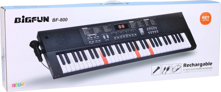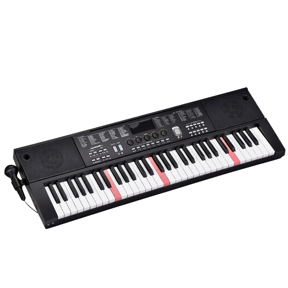 Tastiera elettronica universale con 61 tasti, 200 suoni, 200 accompagnamenti e 70 brani demo, ideale per principianti e utenti avanzati. Offre tasti retroilluminati Key Light per un apprendimento più semplice, un chiaro display LCD, modalità didattiche One Key, Follow, Guide e alimentazione tramite USB. Nella confezione trovi anche microfono e leggio.