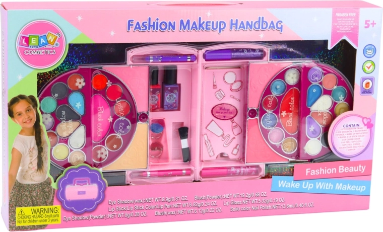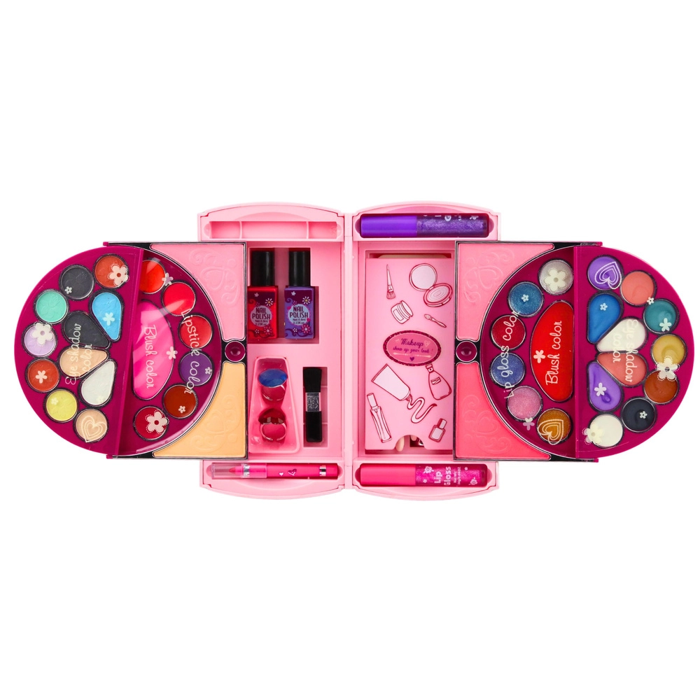 La grande valigetta pieghevole rosa per piccole appassionate di trucco offre un set completo di make-up per bambini e accessori per le unghie. Una volta aperta, si trasforma in una pratica palette organizzata con ombretti, blush, lucidalabbra e smalti, completata da specchietto sicuro, applicatori e spugnette. I cosmetici sono delicati sulla pelle dei bambini, facilmente lavabili con acqua e profumati con una fragranza dolce e fruttata – ideali per il gioco creativo e i primi passi nel mondo della bellezza.