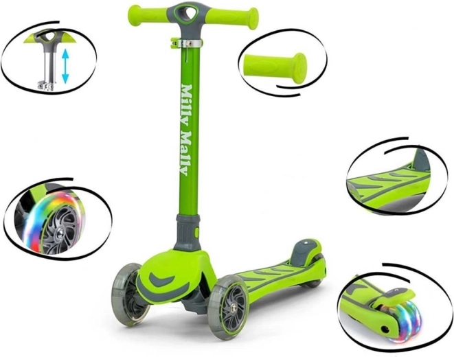 Il Milly Mally Boogie è un monopattino per bambini leggero e resistente, in colore verde, che farà felici i piccoli piloti dai 3 anni. Offre una struttura stabile a tre ruote con doppia ruota posteriore, ruote anteriori luminose e telaio in alluminio per una lunga durata. La sterzata tramite inclinazione del corpo, il manubrio regolabile in altezza e la pedana antiscivolo garantiscono una guida sicura e divertente.
