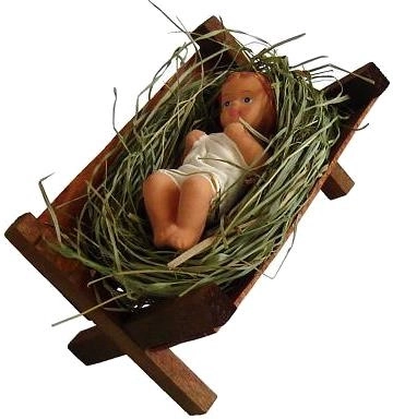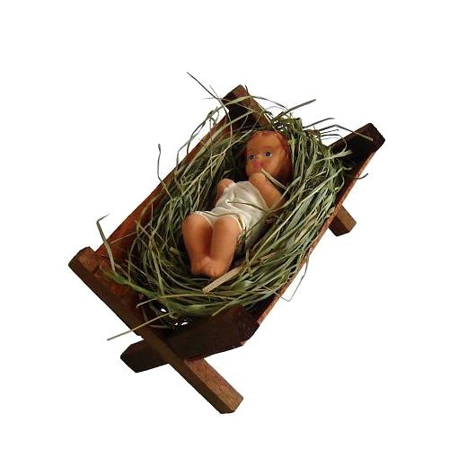 Questa statuina colorata di Gesù Bambino nella mangiatoia è un simbolo tradizionale del Natale che valorizzerà il tuo presepe e renderà più accogliente l’addobbo festivo. Le dimensioni compatte consentono il posizionamento su mensola, tavolo o davanzale, dove spicca per l’aspetto realistico.