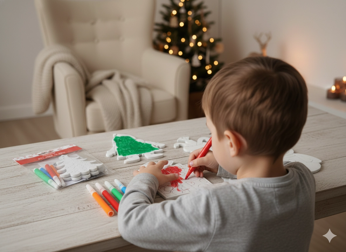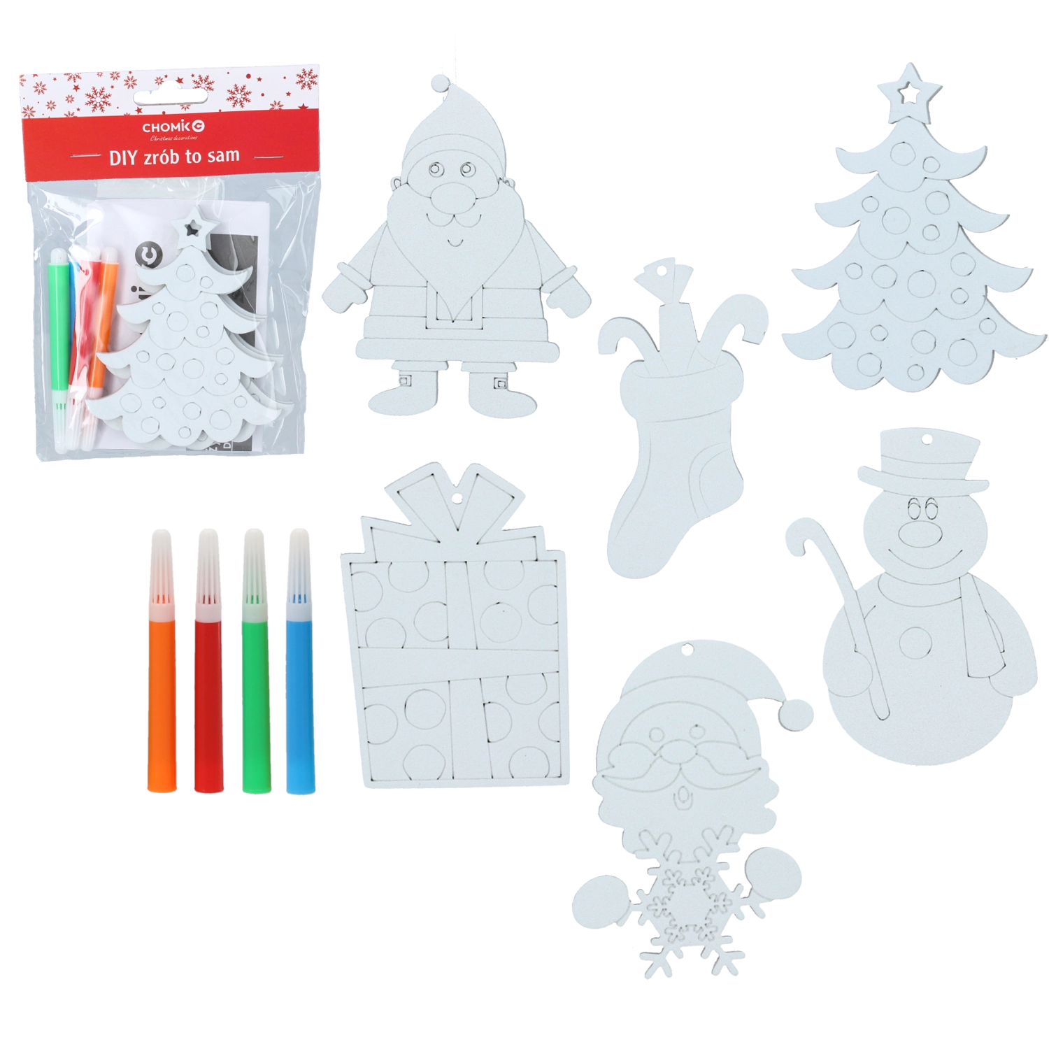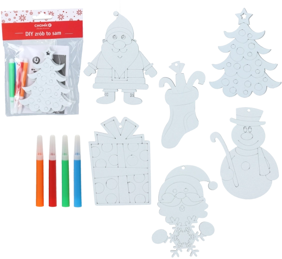 Nella confezione trovi 3 decorazioni da colorare e 4 pennarelli in vivaci tonalità, tutto pronto all’uso. Il mix di motivi (es. pupazzo di neve, Babbo Natale, alberello, calza, regalo) stimola creatività, motricità fine e concentrazione. Ideale per laboratori in casa, scuole d’infanzia e attività ricreative.