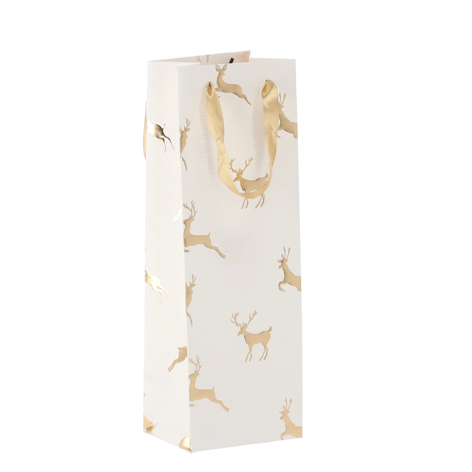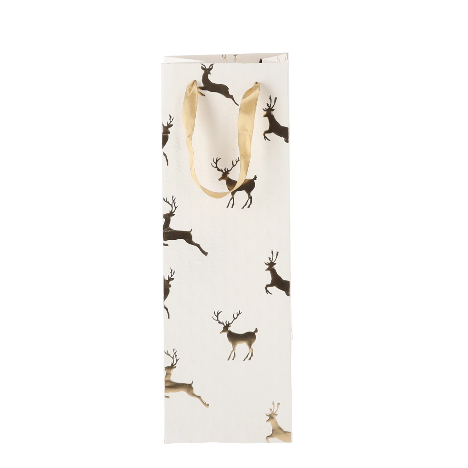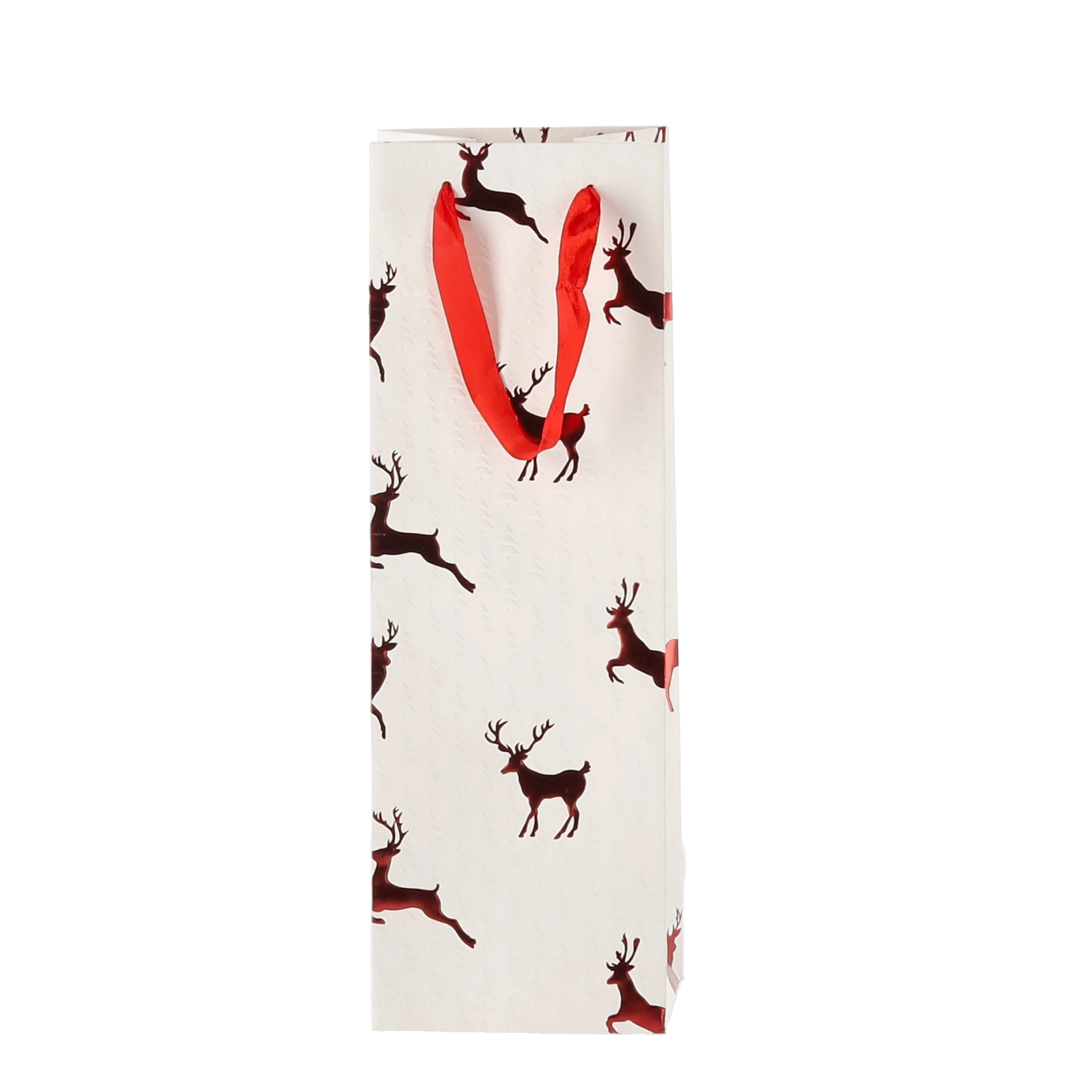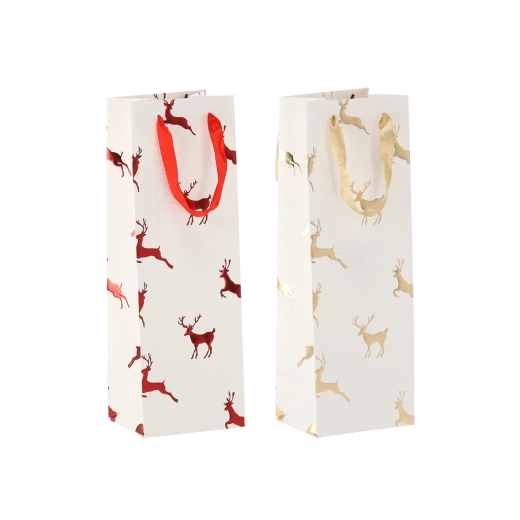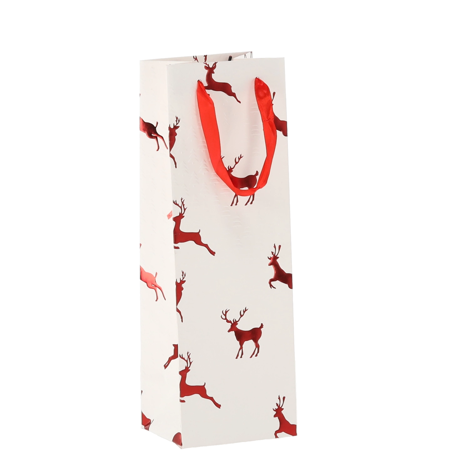 Questa busta regalo natalizia per vino aggiunge un tocco di classe ai tuoi doni. La carta di qualità con grammatura 210 g/m² assicura elevata resistenza e durata, mentre i manici in raso rendono il trasporto confortevole e valorizzano il design festivo con motivi di renne.