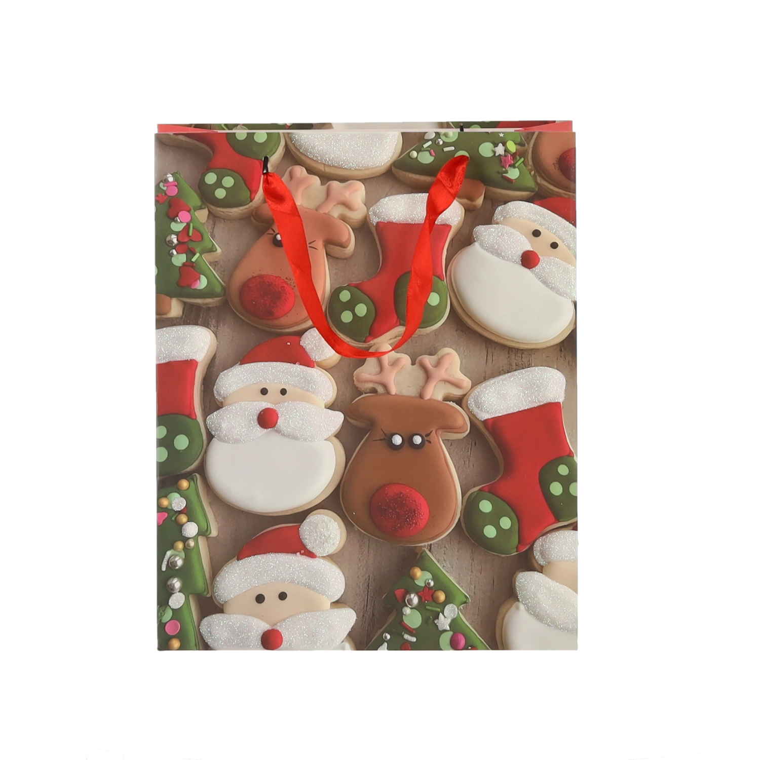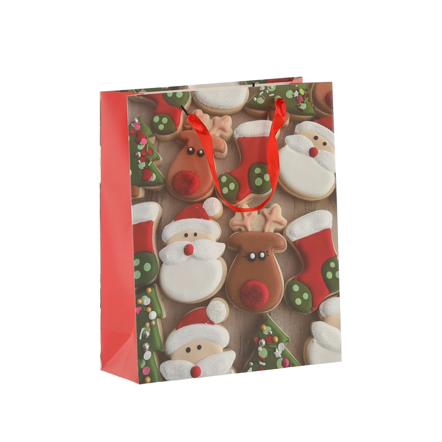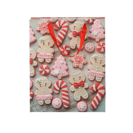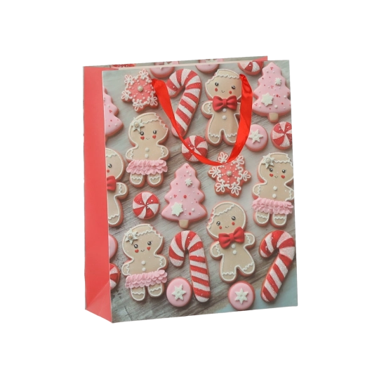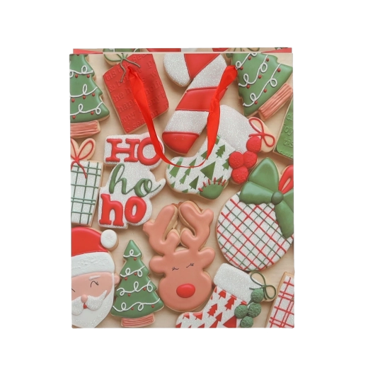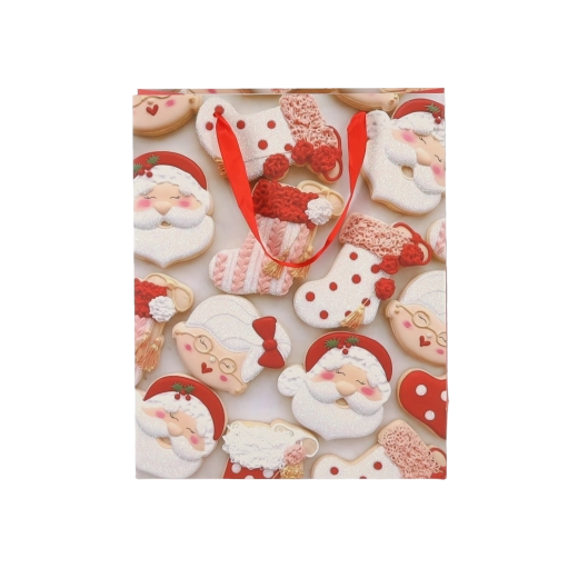 Pratico set da 12 borse regalo natalizie nel formato 18 × 24 × 8 cm per un confezionamento rapido e alla moda di piccoli doni. Le borse in carta di qualità con grammatura 157 g/m² sono robuste e resistenti, dotate di manico a nastro rosso per un trasporto confortevole e presentano una vivace stampa con motivi di biscotti natalizi – Babbo Natale, renna, alberelli e guanti. Ideali per cosmetici, gioielli e libri di piccole dimensioni.