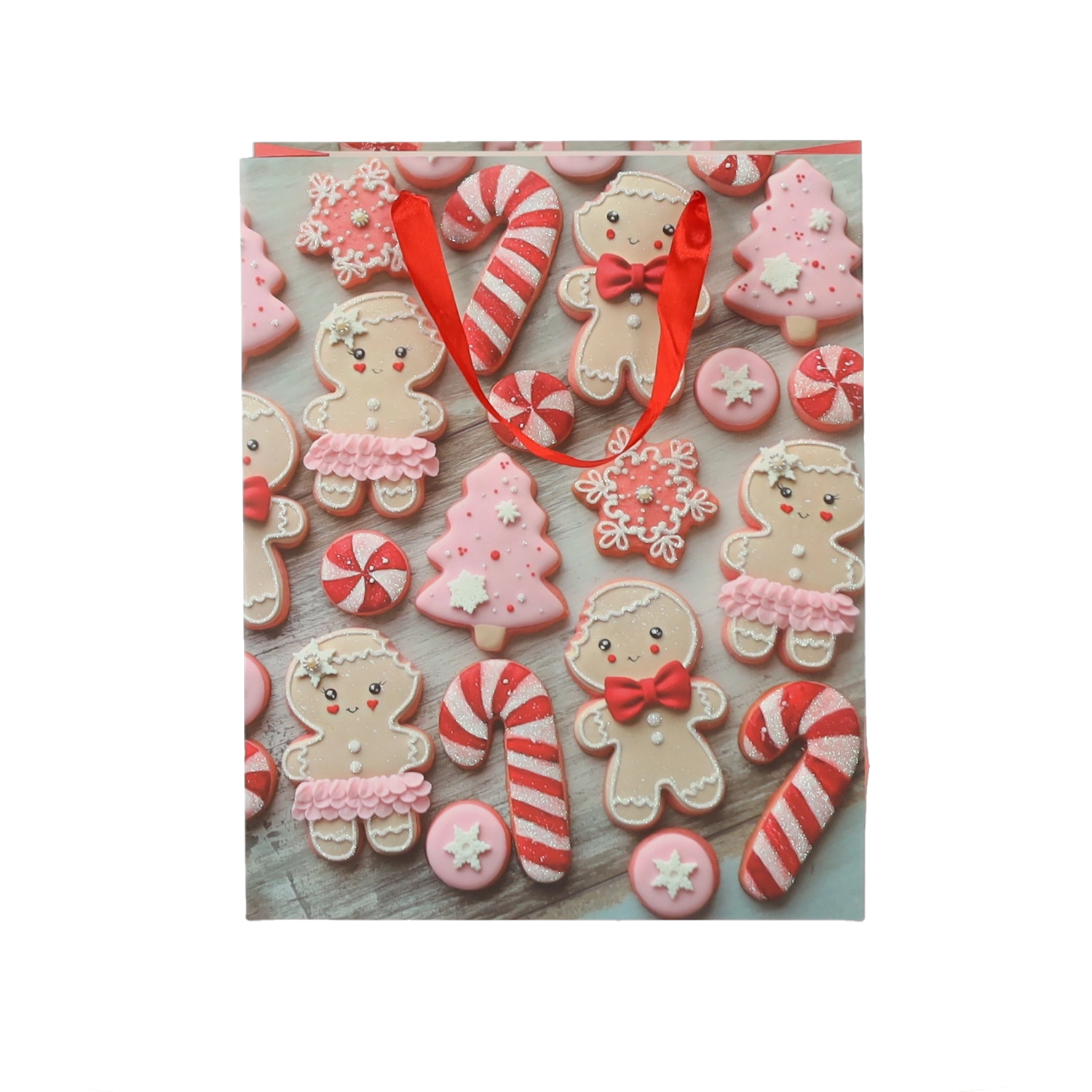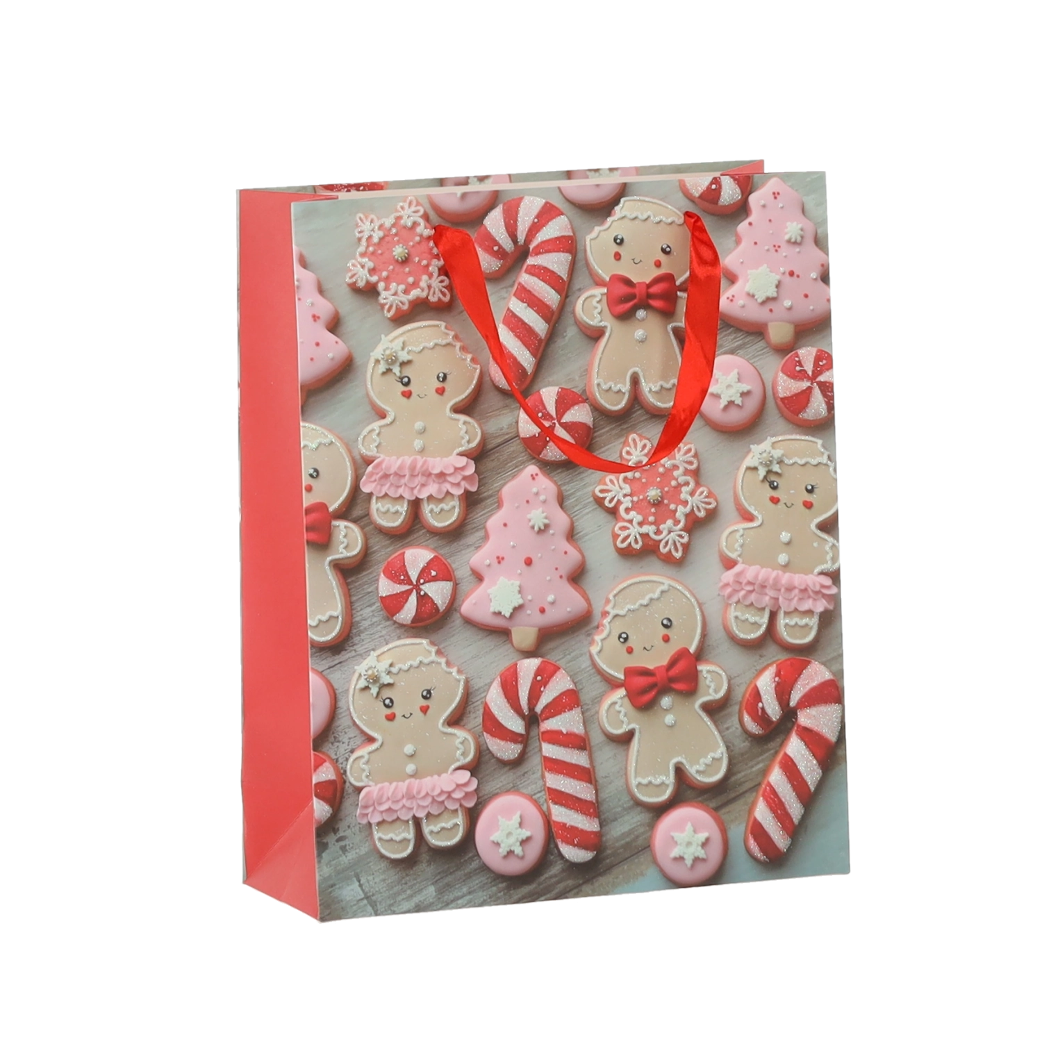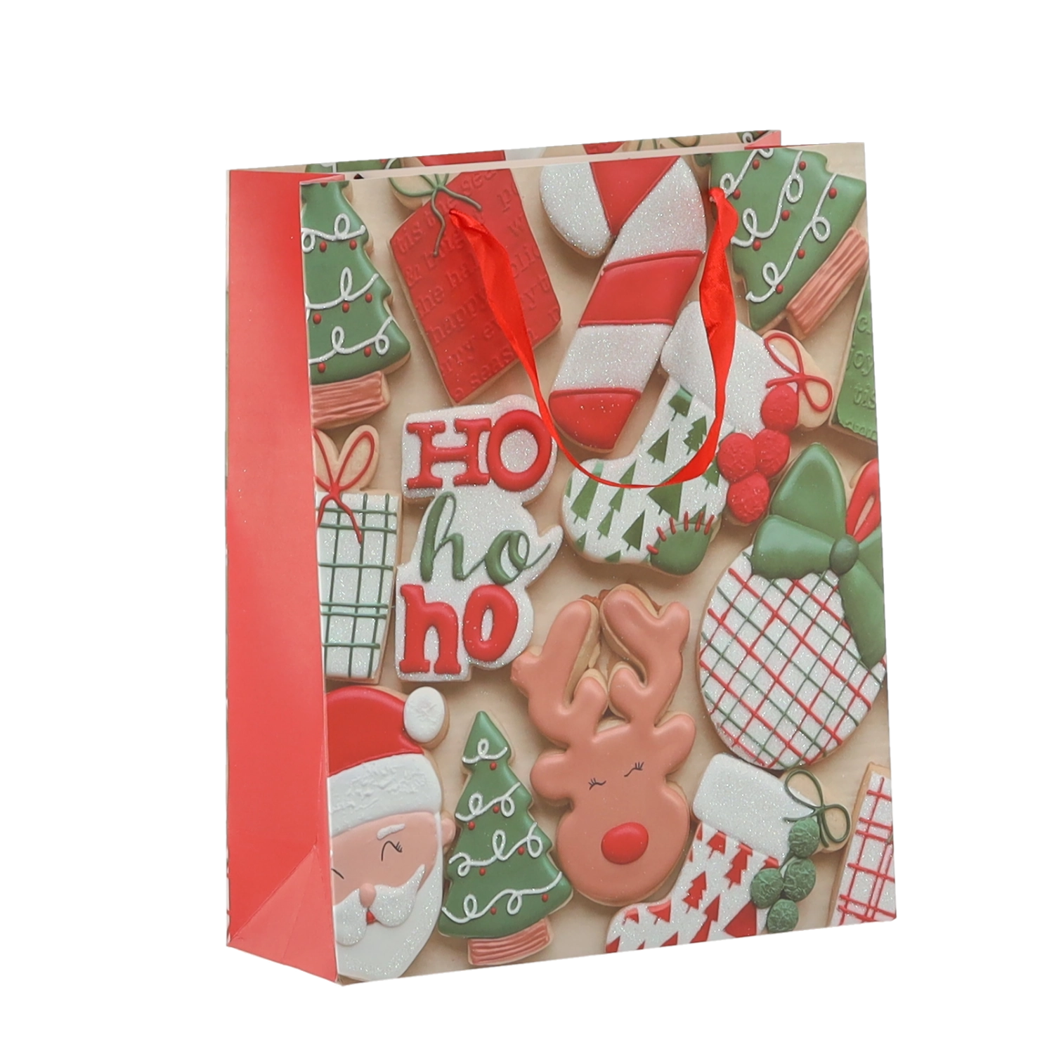 Pratico set da 12 borse regalo natalizie nel formato 18 × 24 × 8 cm per un confezionamento rapido e alla moda di piccoli doni. Le borse in carta di qualità con grammatura 157 g/m² sono robuste e resistenti, dotate di manico a nastro rosso per un trasporto confortevole e presentano una vivace stampa con motivi di biscotti natalizi – Babbo Natale, renna, alberelli e guanti. Ideali per cosmetici, gioielli e libri di piccole dimensioni.