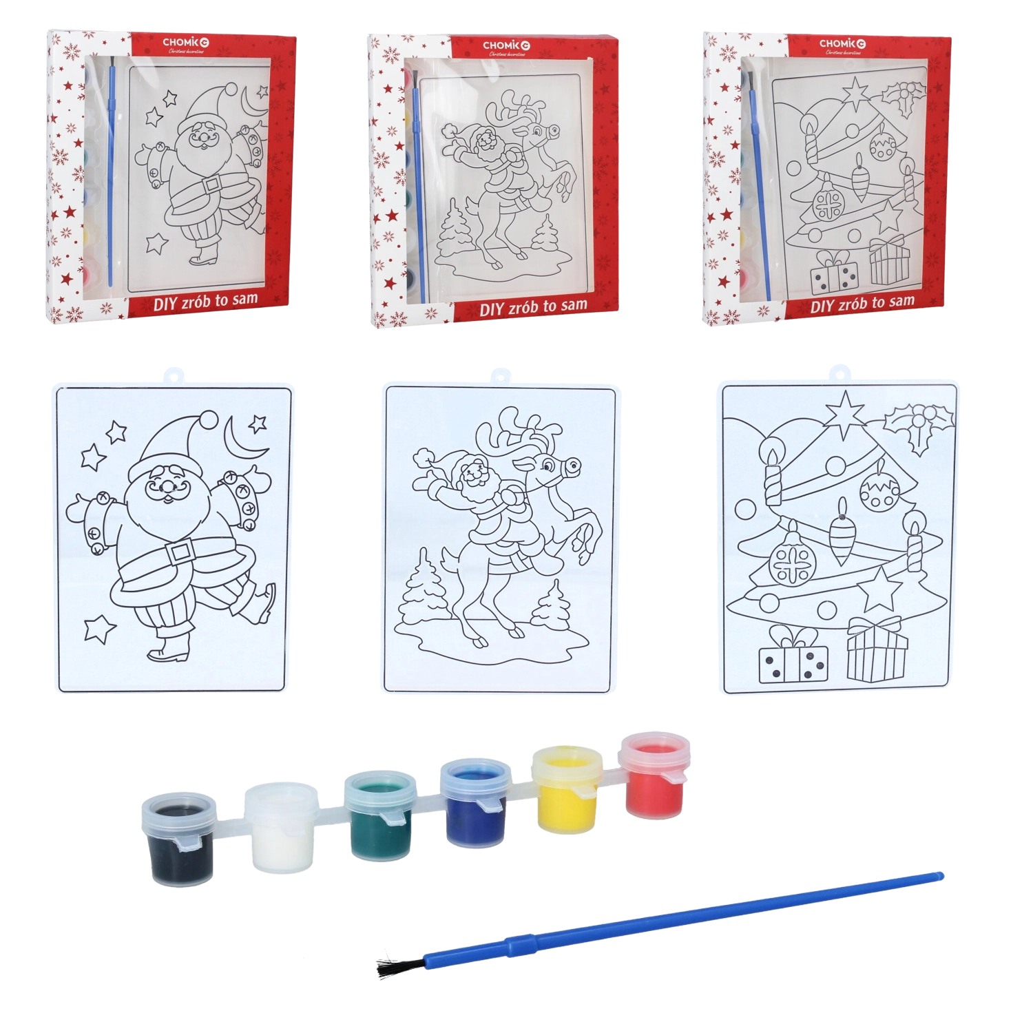 Colora Babbo Natale, l’albero o la renna – un mix di motivi per un addobbo festivo vario e allegro.
