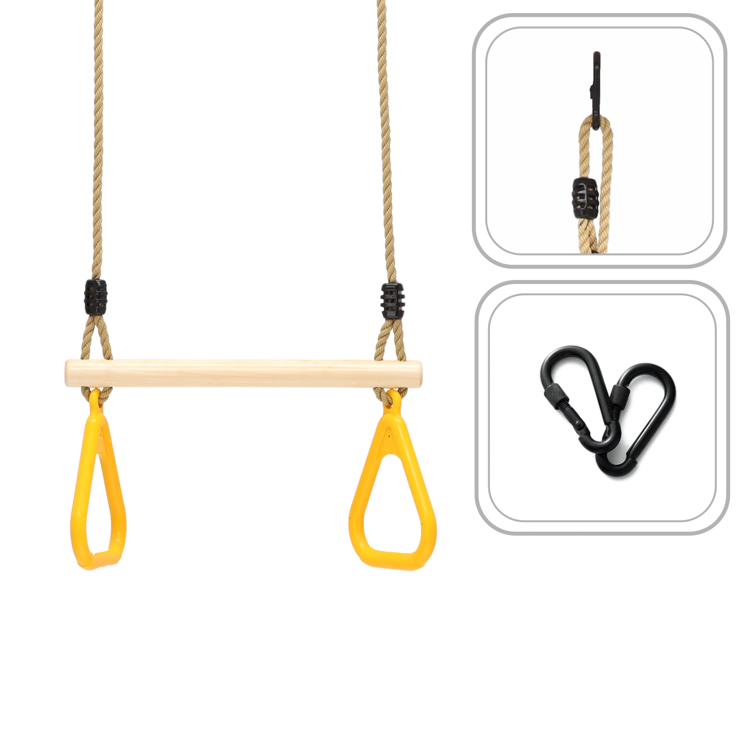 Scopri la gioia del movimento con l'altalena trapezoidale per bambini, che unisce resistenza, sicurezza e design senza tempo. La barra trasversale in legno e le maniglie sagomate favoriscono una presa corretta, rafforzano la parte superiore del corpo e motivano i bambini ad attività salutari all'aria aperta.