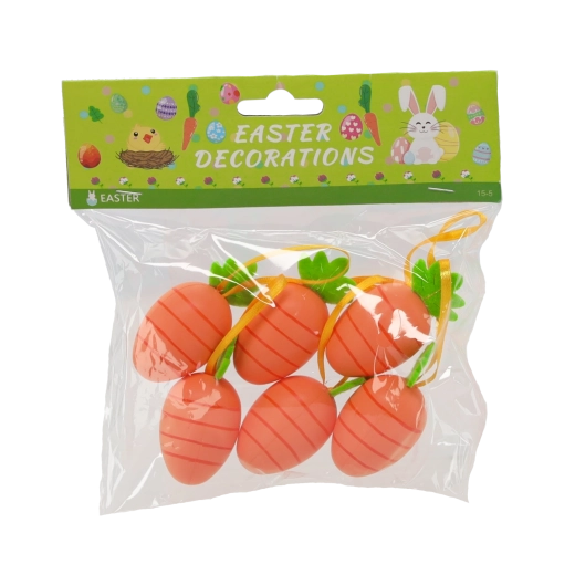 Decora la tua casa con un'atmosfera primaverile e pasquale con il set di sei carote decorative con asola. Queste piccole carotine hanno un aspetto realistico, colori vivaci e grazie all'asola si appendono facilmente a rametti, ghirlande o altre decorazioni. Sono leggerissime, resistenti e perfette per la decorazione d'interni.