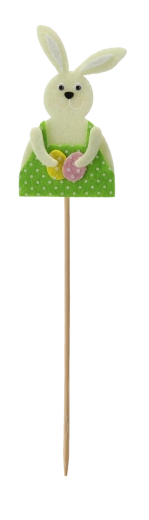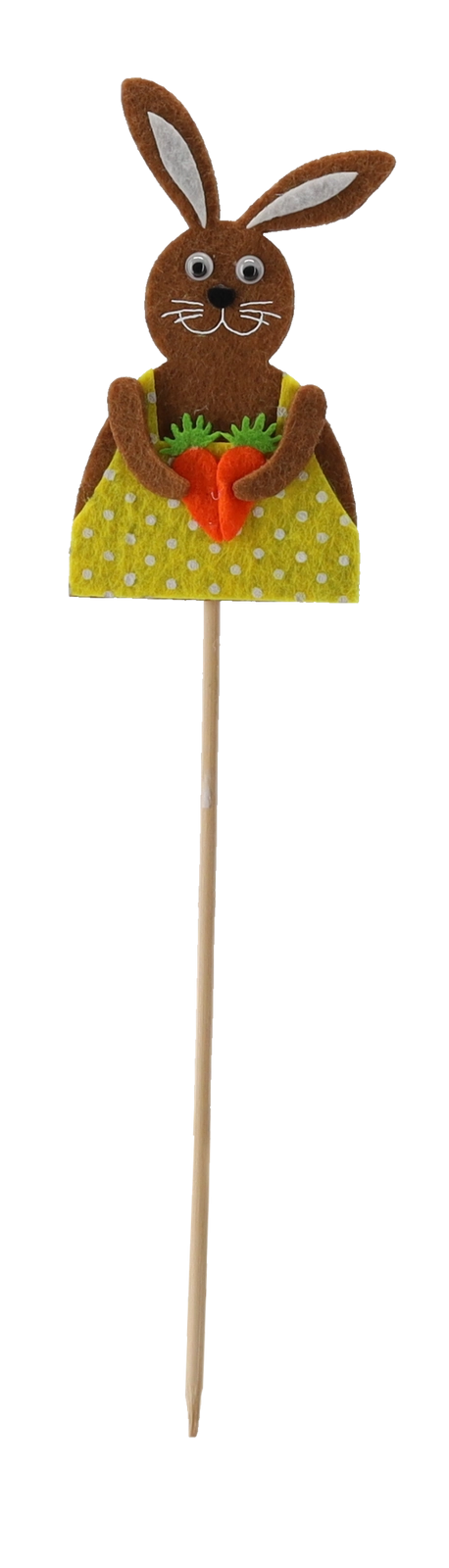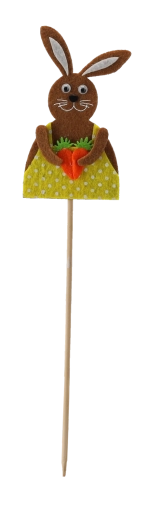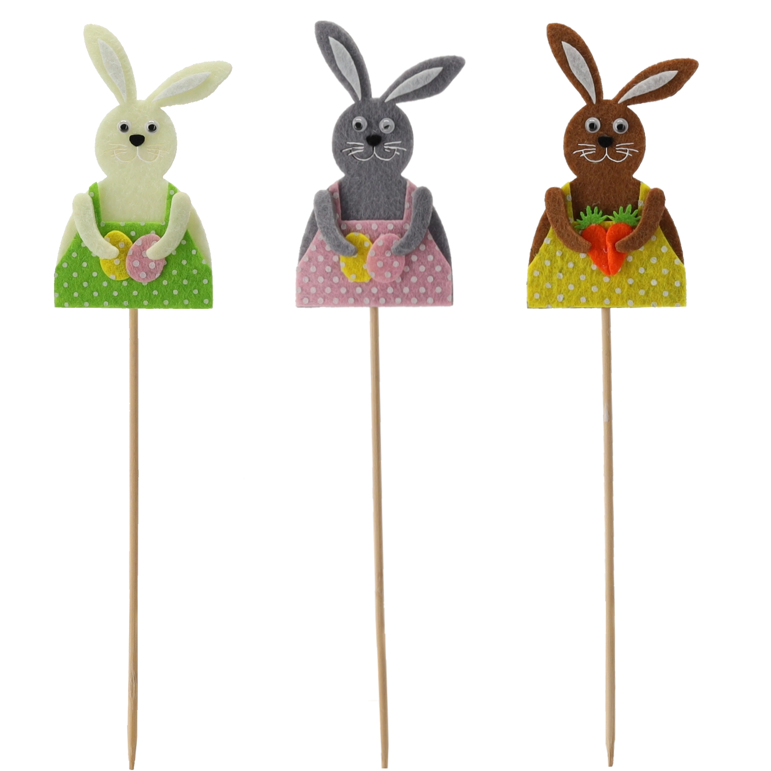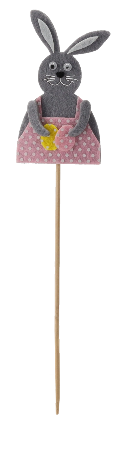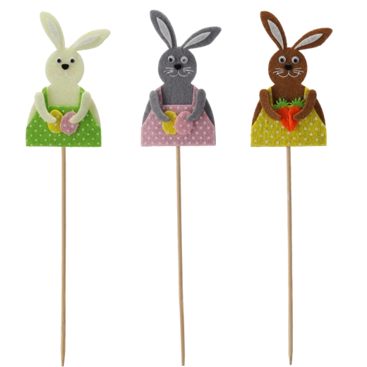 I coniglietti su stecchino di legno sono realizzati in morbido tessuto/feltro con delicati dettagli, per un effetto giocoso che dona alla casa la tipica atmosfera pasquale. Grazie all’esile bastoncino si inseriscono facilmente nella terra, nella spugna da fiorista e tra gli steli dei fiori, dove restano ben saldi e in evidenza.
