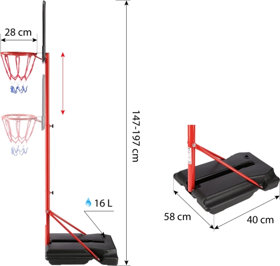 - Regolabile in altezza – struttura a 1,47 o 1,97 m; anello a 1,07 o 1,57 m