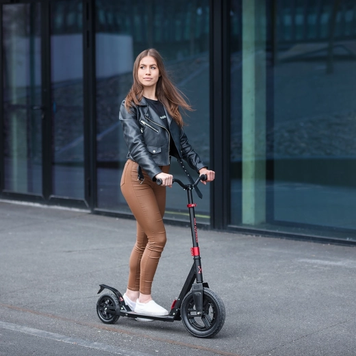 Per una guida fluida senza vibrazioni superflue, le ruote montano cuscinetti ABEC 7. Il monopattino supporta un carico fino a 100 kg e, grazie alla pedana antiscivolo, offre un appoggio saldo anche in condizioni meno favorevoli.