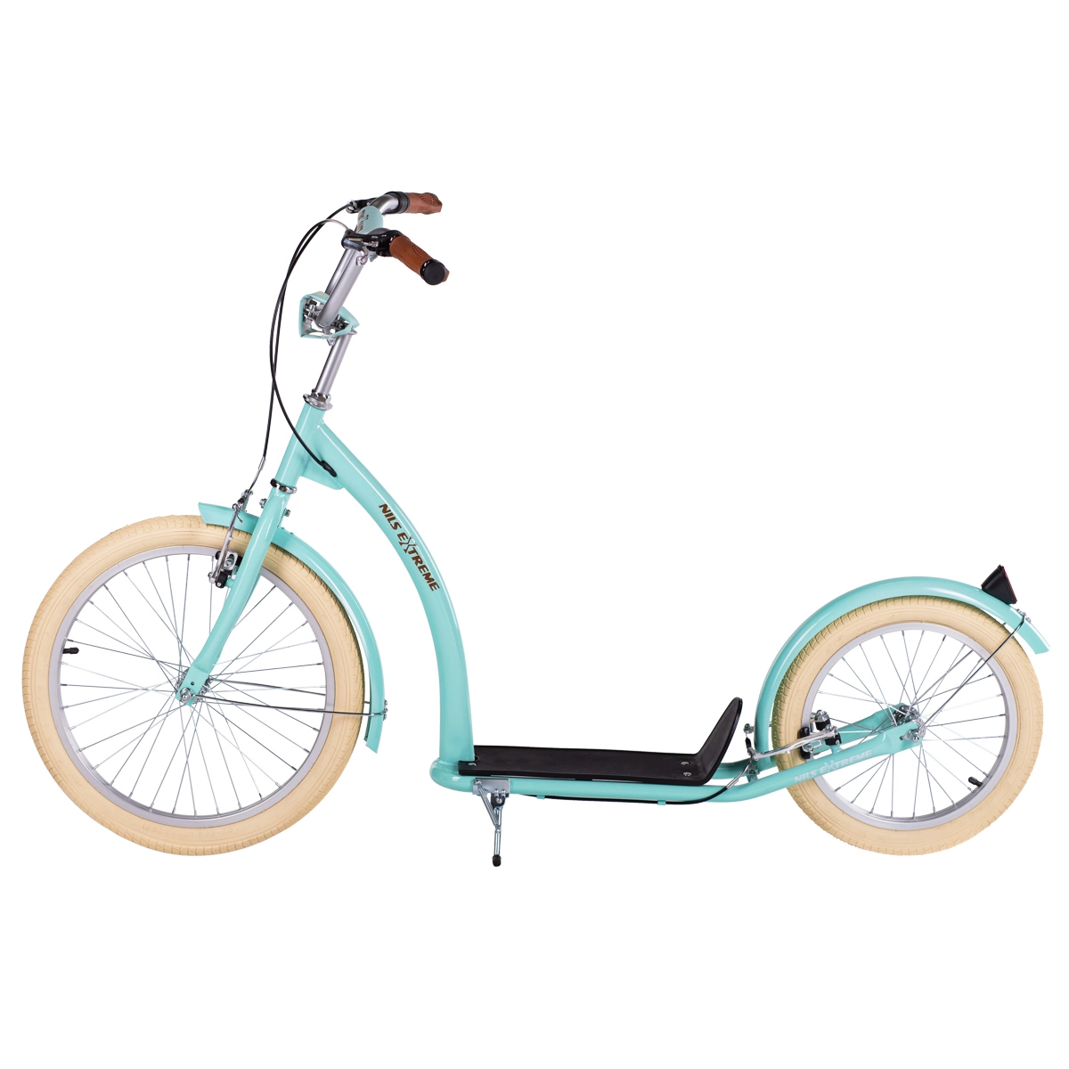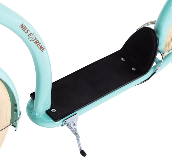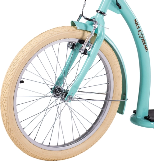 Il monopattino NILS Extreme WH222 in colore menta è progettato per spostamenti comodi e sicuri in città e fuori. Le grandi gomme pneumatiche su cerchi in alluminio attenuano le asperità, mentre il telaio in acciaio assicura robustezza e lunga durata. La ruota anteriore da 20" e quella posteriore da 16" aumentano stabilità, capacità di superare gli ostacoli e sicurezza in curva.