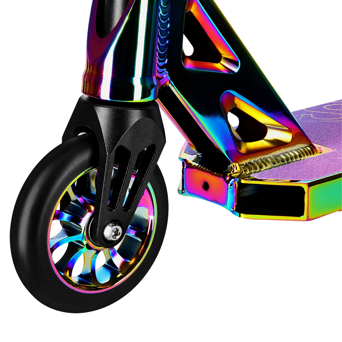 Monopattino freestyle resistente per bambini, giovani e adulti con deck in alluminio robusto e manubrio in acciaio. Offre ruote veloci da 110 mm con cuscinetti ABEC 9, sicuro freno posteriore flex fender e struttura robusta senza meccanismo di chiusura per massima sicurezza nei trick.