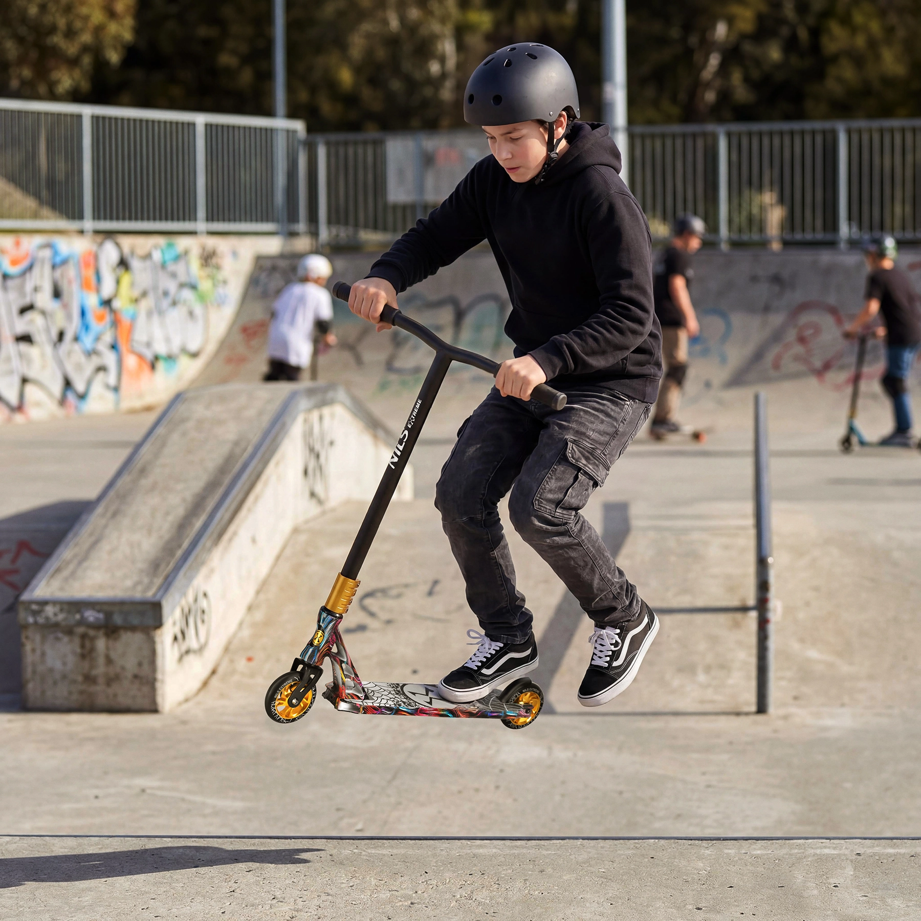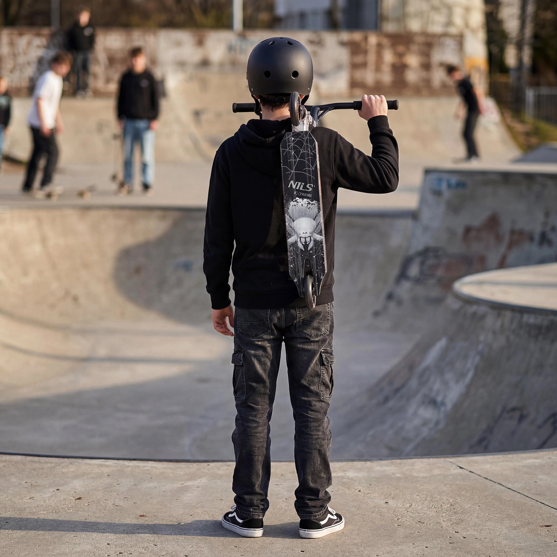 Il monopattino NILS Extreme Spider HS221 è progettato per trick, salti e atterraggi fluidi. Il telaio rigido senza meccanismo pieghevole aumenta la rigidità, la stabilità e la precisione di controllo. Il manubrio T‑bar nero con comode manopole in TPE mantiene la traiettoria anche nei trick più impegnativi, mentre il deck compatto con grip aderente offre sicurezza sotto i piedi.