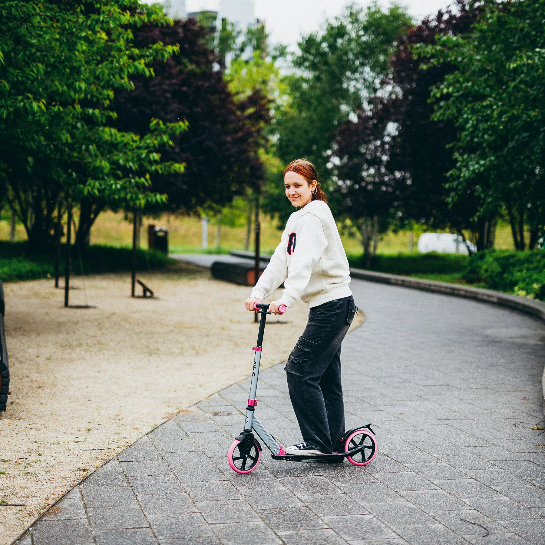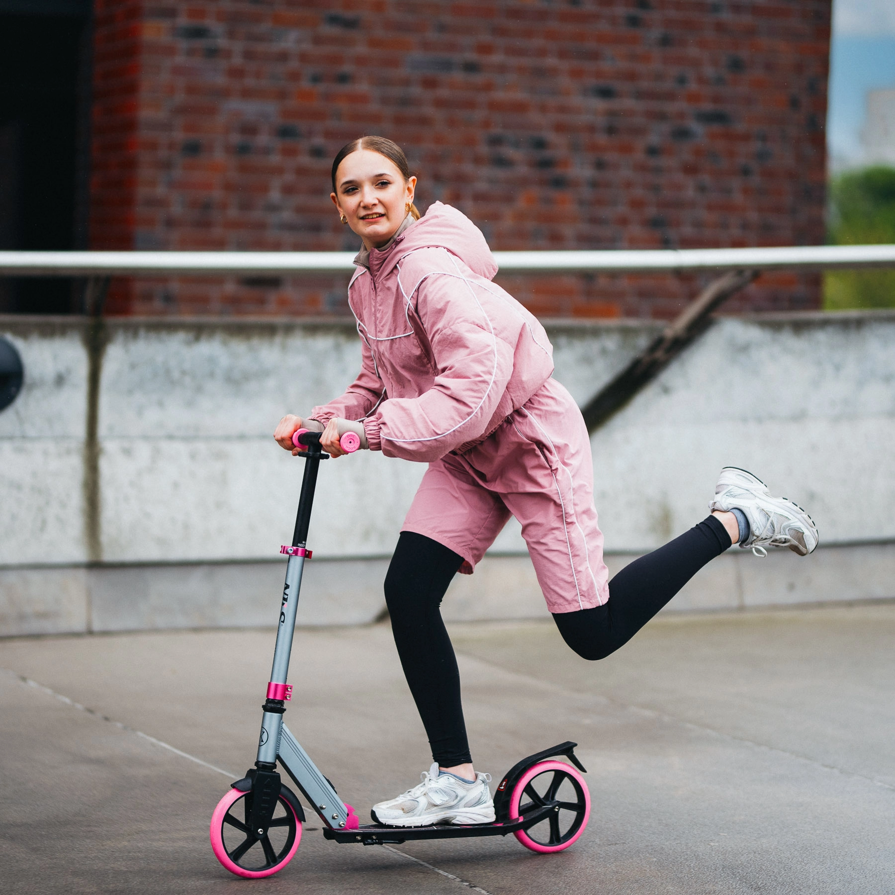 Le grandi ruote in PU da 200 mm abbinate a cuscinetti ABEC 7 offrono una guida fluida e silenziosa su asfalto e marciapiedi compatti. Le manopole ergonomiche in TPR, l’altezza del manubrio regolabile (79–93 cm) e il deck basso migliorano stabilità e comfort, mentre il freno posteriore a pedale assicura un’arresto affidabile.