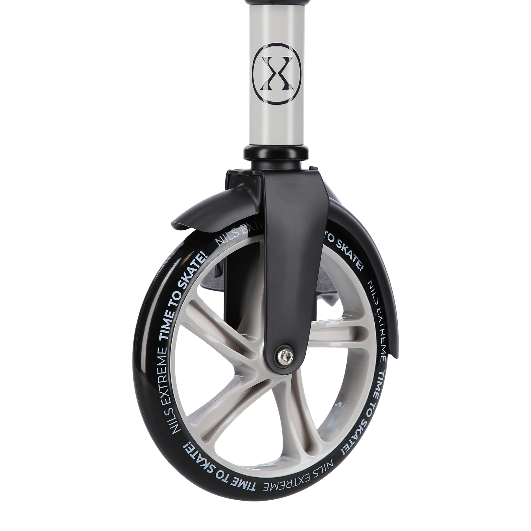 Le grandi ruote in PU da 200 mm con cuscinetti ABEC 7 garantiscono una guida veloce, silenziosa e scorrevole su marciapiedi e piste ciclabili. Il manubrio regolabile (75–95 cm) con comode manopole in gomma si adatta all'altezza del rider e il freno a pedale sul parafango posteriore offre una decelerazione affidabile.