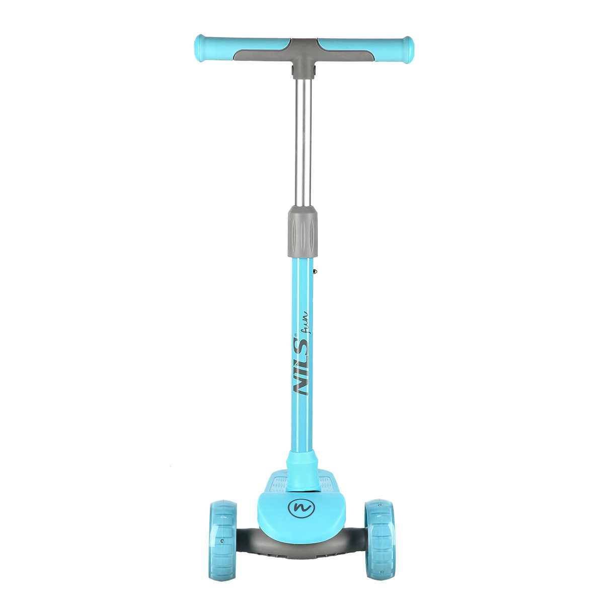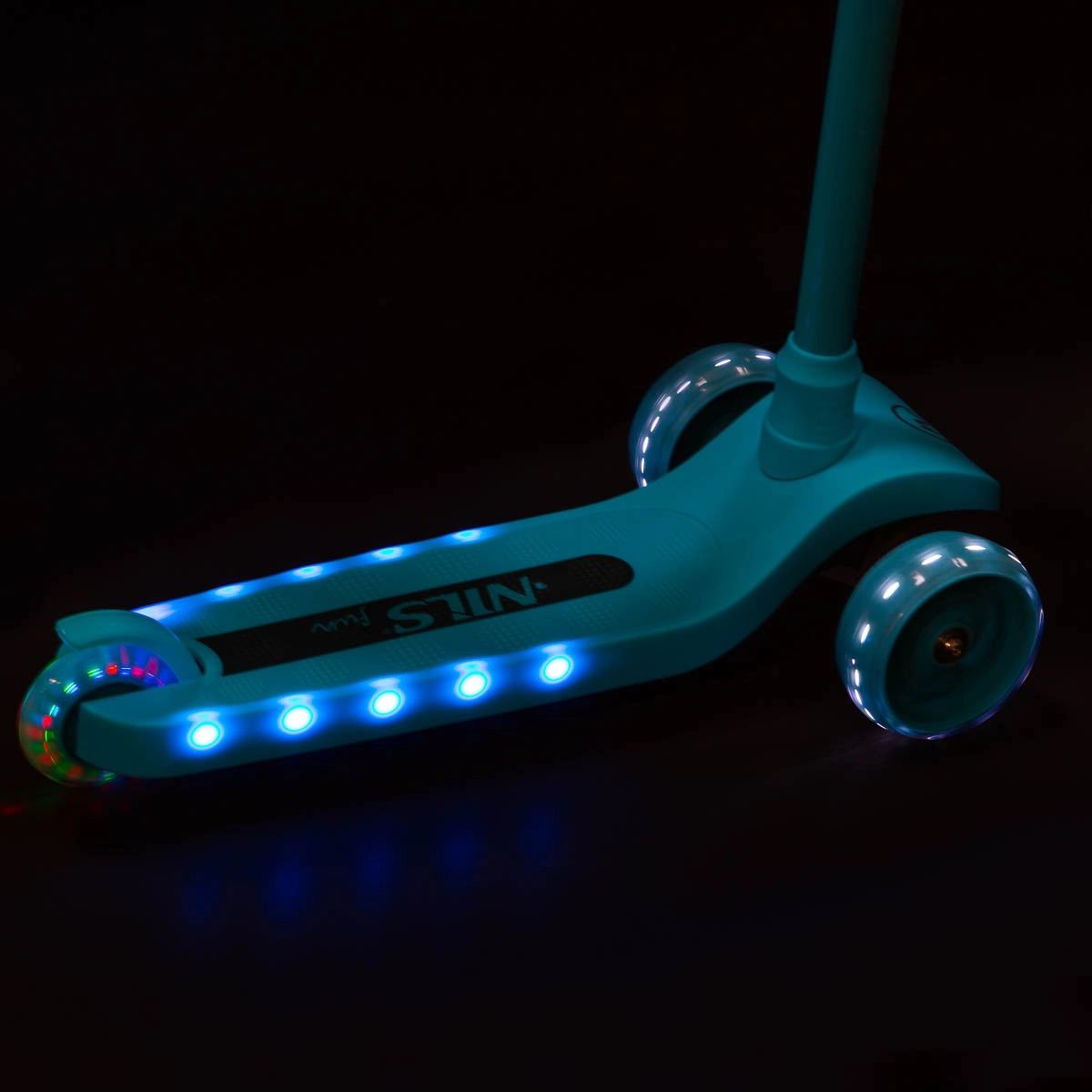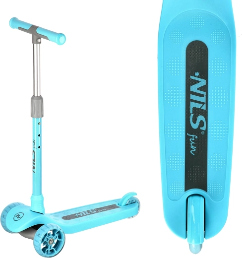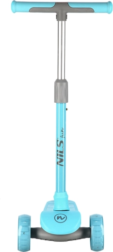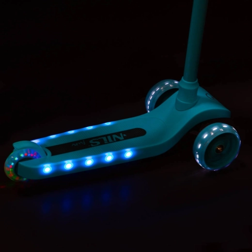 Monopattino per bambini NILS Fun, leggero e stabile, con tre ruote, sterzo basato sull’inclinazione e manubrio regolabile in altezza su 3 posizioni. Offre ruote LED luminose e fiancate del pianale illuminate a LED, superficie antiscivolo e freno a pedale sicuro. Ideale per principianti su superfici piane.