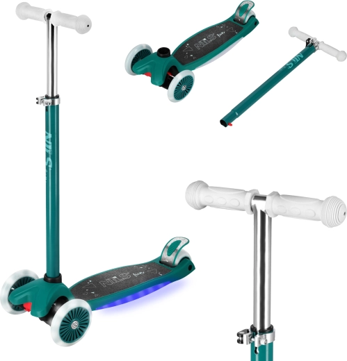 Grazie alle due ruote anteriori e al sistema di sterzo intuitivo tramite inclinazione, questo monopattino è ideale sia per principianti che per bambini più esperti. La pedana ampia antiscivolo con effetto LED aumenta visibilità e appeal, mentre il manubrio T-bar regolabile (78/84/90 cm) permette al monopattino di crescere con il bambino.